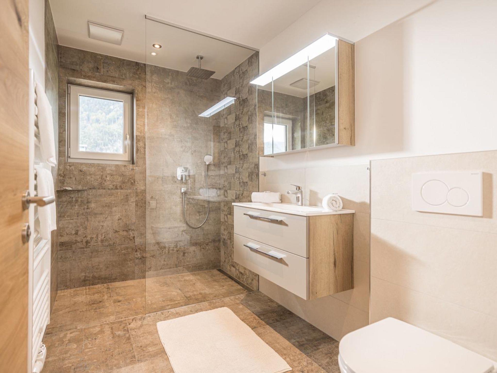 Das moderne Badezimmer verfügt über eine Regendusche, Waschtisch mit Spiegel, WC, Föhn und Handtücher.