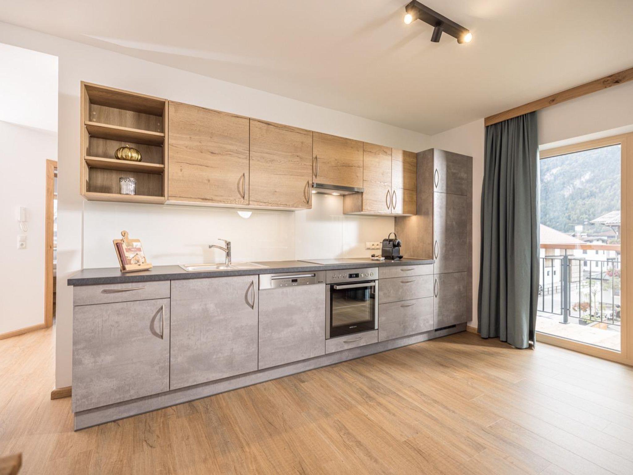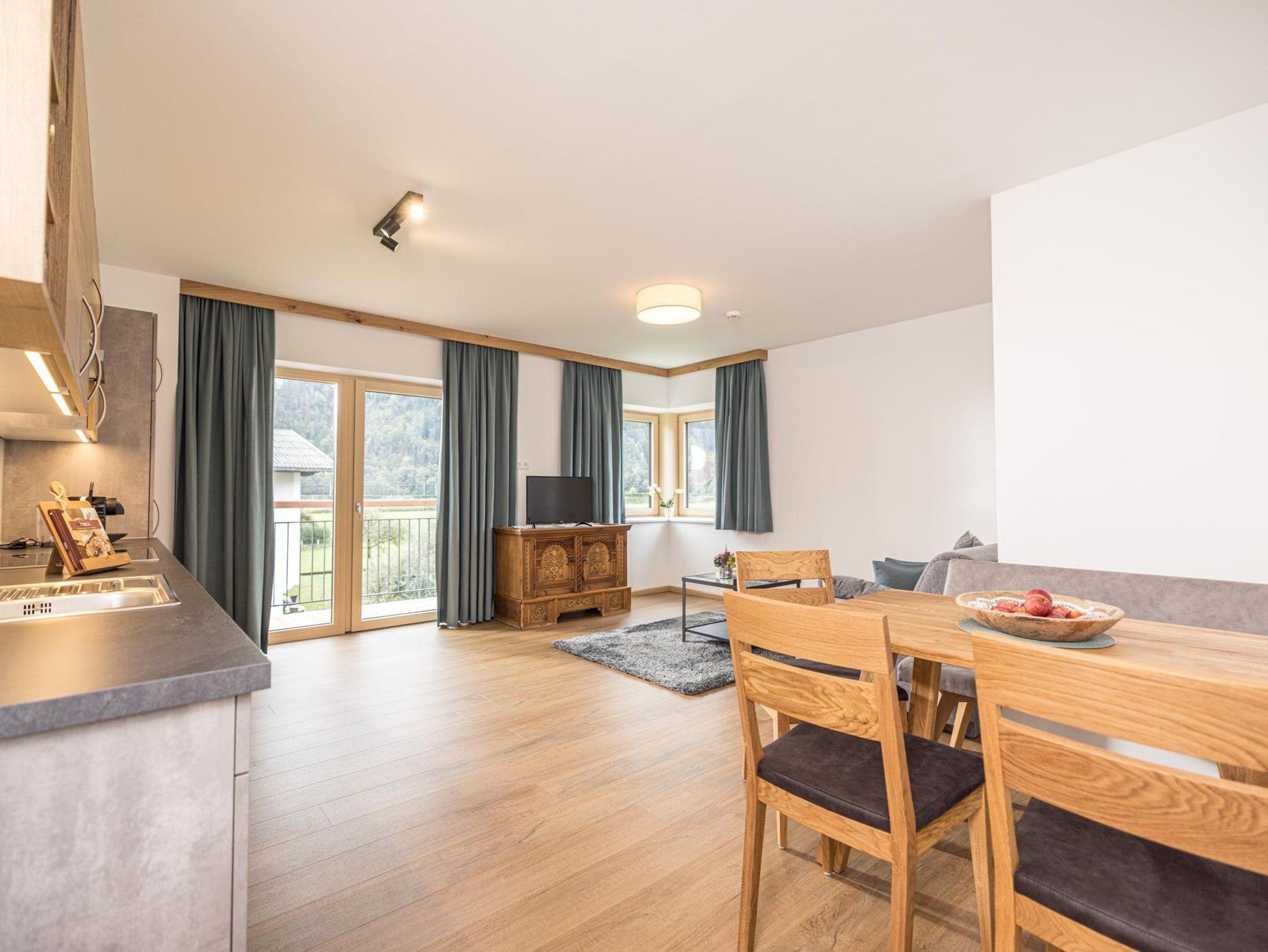 Das Appartement Entspannung befindet sich im 2. Obergeschoss (63m2) und bietet Platz für bis zu sechs Personen. Das Appartement mit Blick auf den Rattenberger Schlossberg sowie das Inntal verfügt über zwei getrennte Schlafzimmer mit einem großzügigen Doppelbett sowie einem Grand – Lit (1,40 x 2,00m) und einem Wohn - Essbereich. Die Küche ist voll ausgestattet: Nespresso Maschine, Wasserkocher, Kühlschrank mit Gefrierfach, Backofen, 4- Platten Cerankochfeld, Geschirrspüler, Kochuntensilien und Geschirrtücher. TV Geräte finden Sie im Wohn - Essbereich wie auch in den Schlafzimmern vor. Ebenfalls bietet das Appartement eine gemütliche Essecke sowie ein Ausziehsofa an.