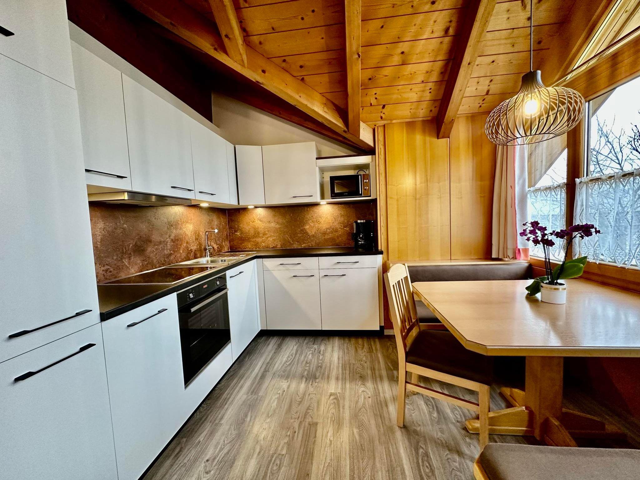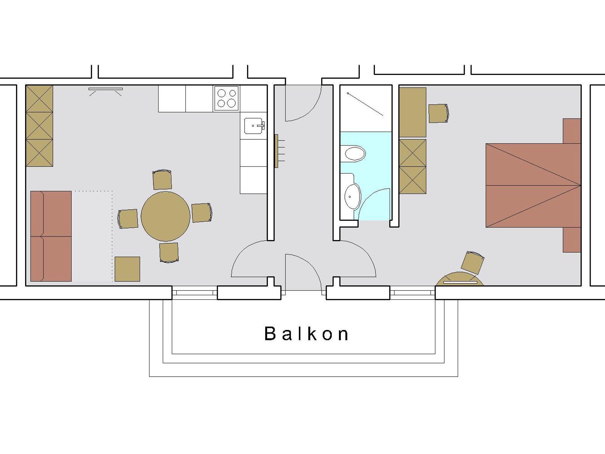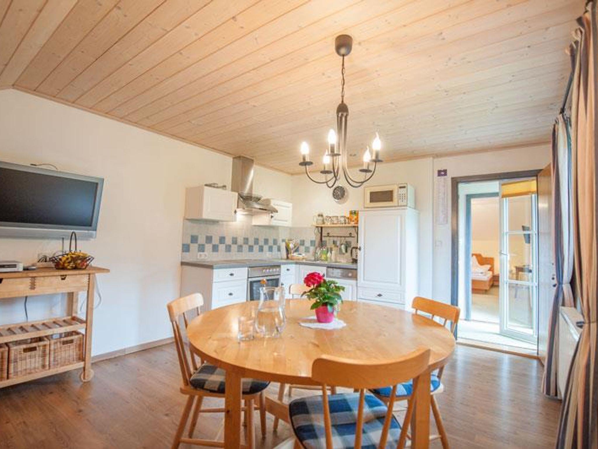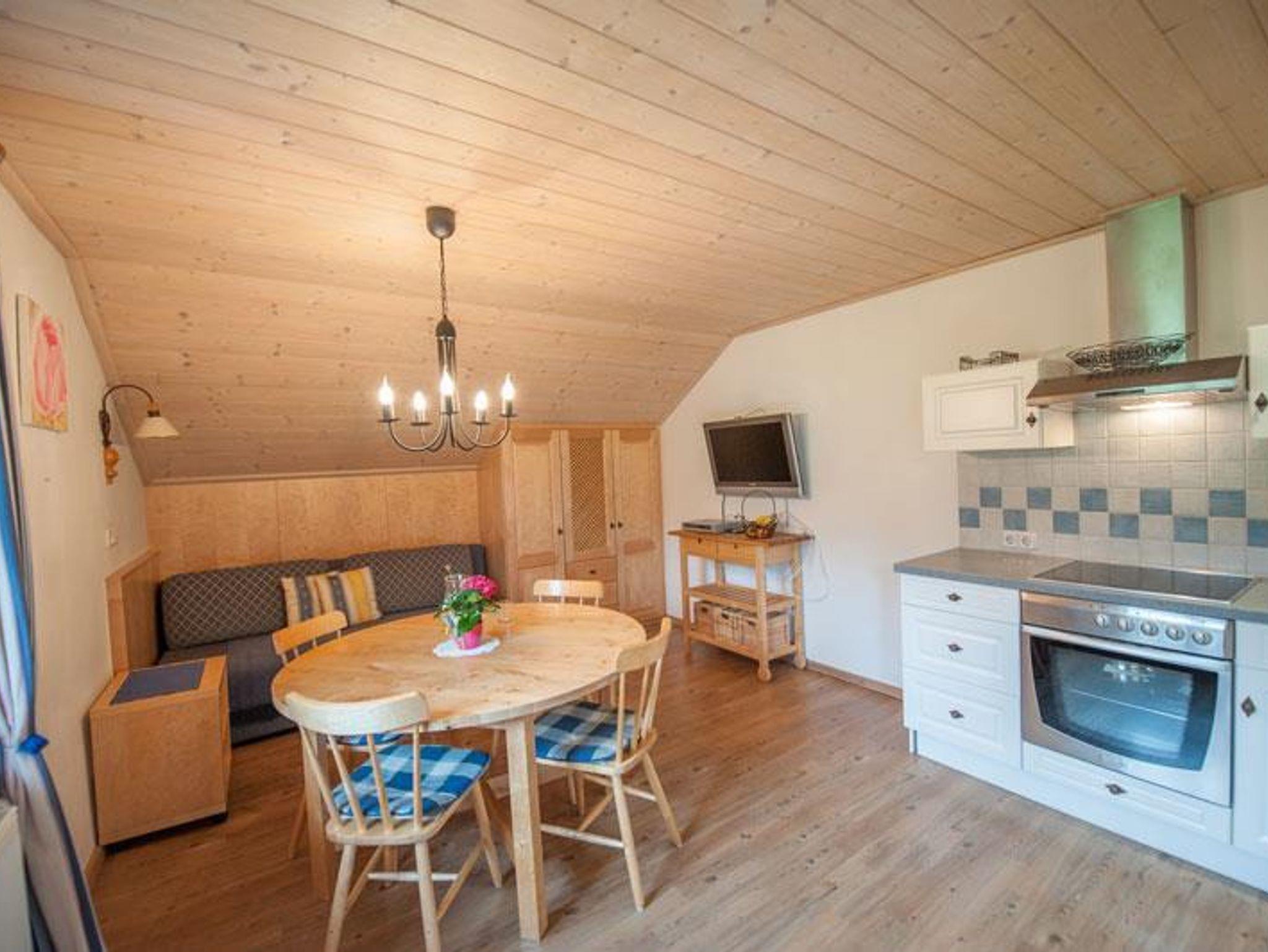 Die Ferienwohnung befindet sich im Haupthaus im 2. Stock, ist 45 m² groß und verfügt über ein Schlafzimmer mit Doppelbett und DU/WC. Die vollständig ausgestattete Küche ist ein extra Raum mit einer Couch. Vorraum. Sehr schöner südseitiger Balkon.