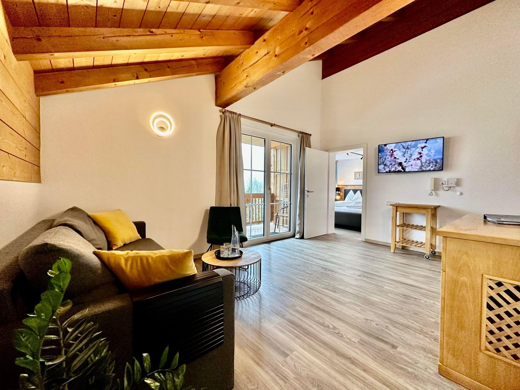 Die Ferienwohnung befindet sich im Haupthaus im 2. Stock, ist 45 m² groß und verfügt über ein Schlafzimmer mit Doppelbett und DU/WC. Die vollständig ausgestattete Küche ist ein extra Raum mit einer Couch. Vorraum. Sehr schöner südseitiger Balkon.
