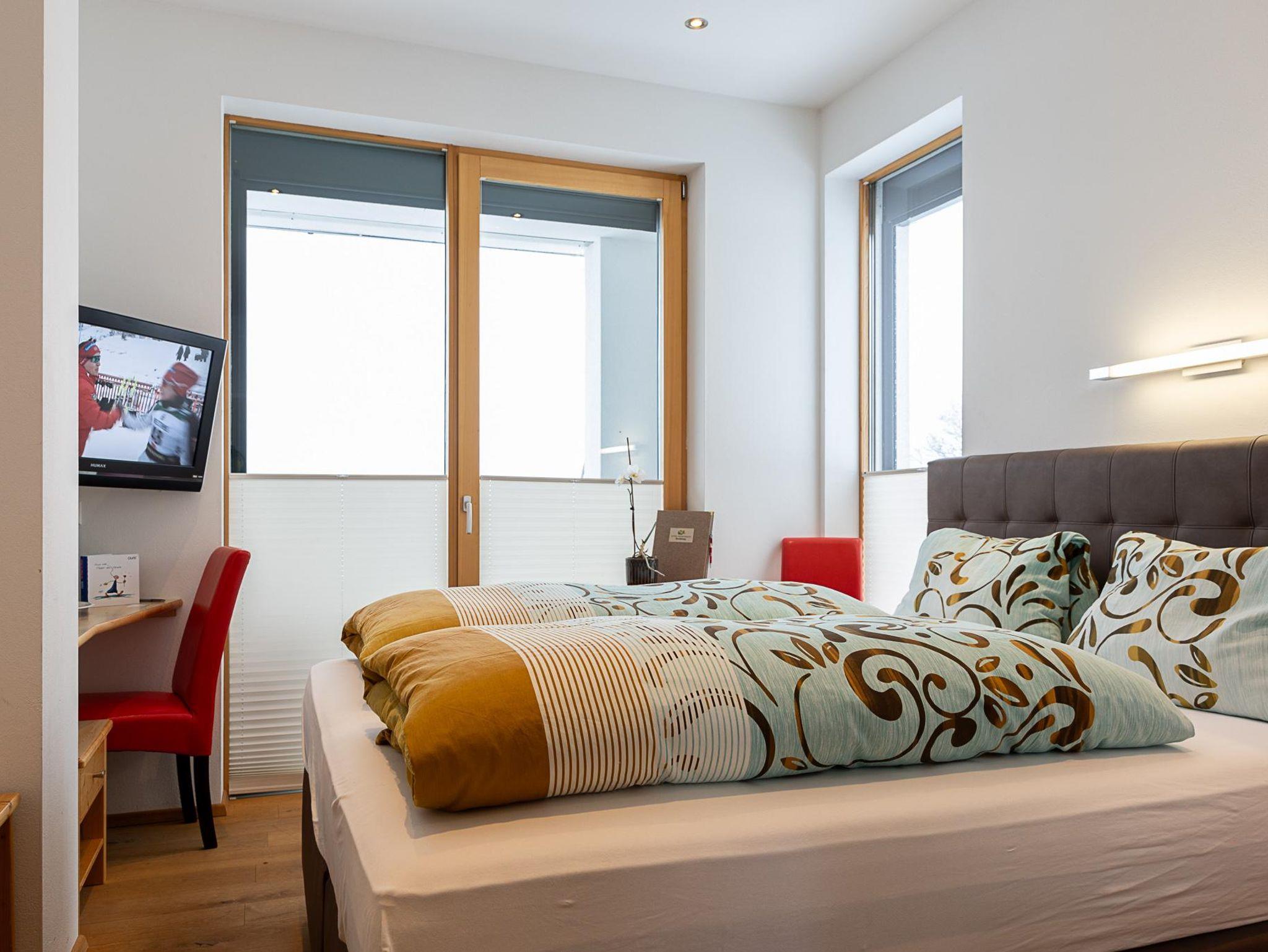 Ankommen und Wohlfühlen in unserem komfortablen Doppelzimmer (18m²) mit Sat-TV, Dusche/WC, Haarfön, Safe und gratis W-Lan und einem Balkon mit herrlichem Berg- und Panoramablick mit allen Leistungen wie im Hotel.