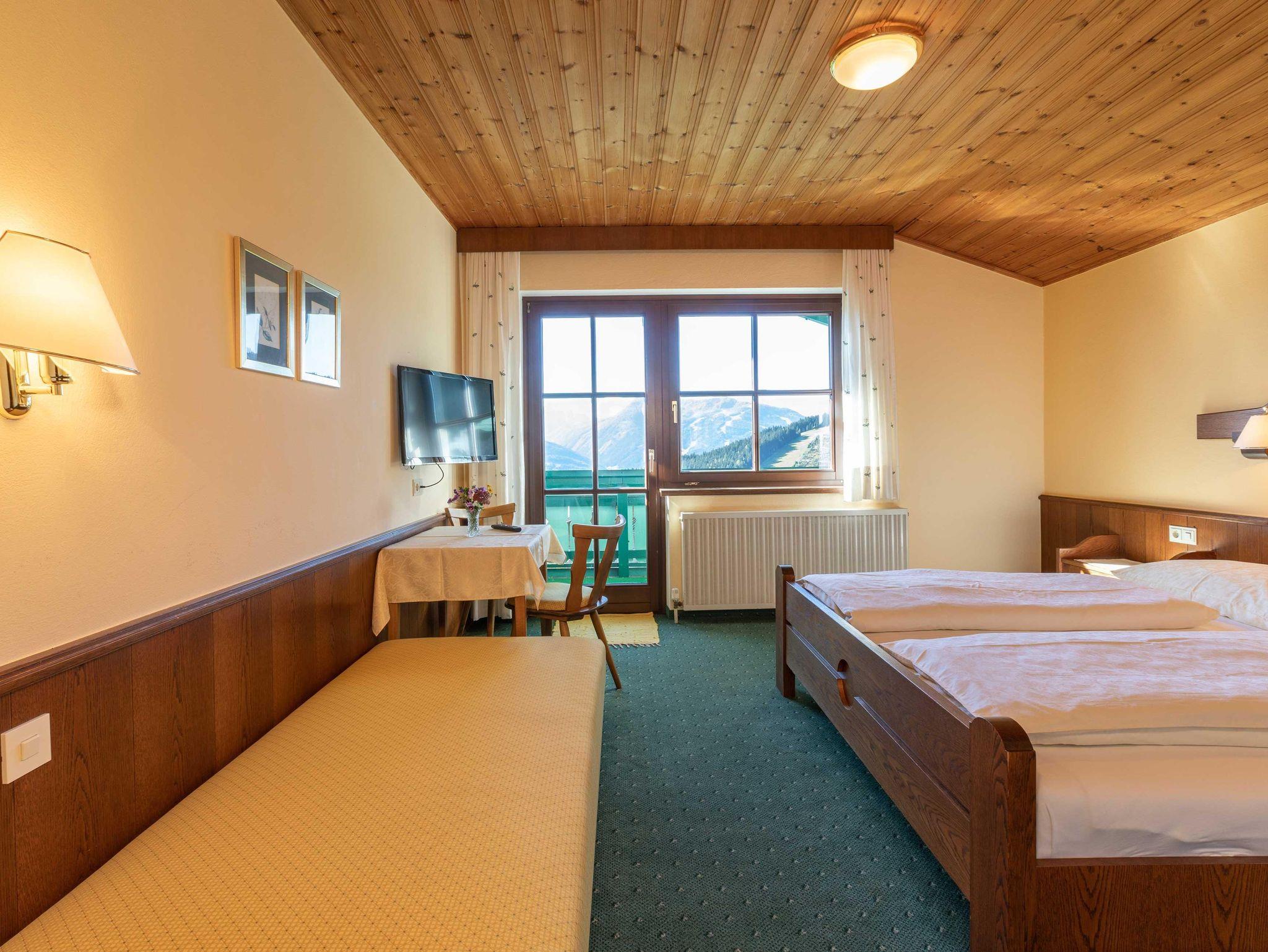 Wir bieten geräumige Dreibettzimmer für 2-3 Personen. Die Zimmer verfügen über einen Vorraum, Sitzecke, Badezimmer mit Dusche/WC/Föhn, gratis W-LAN, Flat-TV und Balkon.