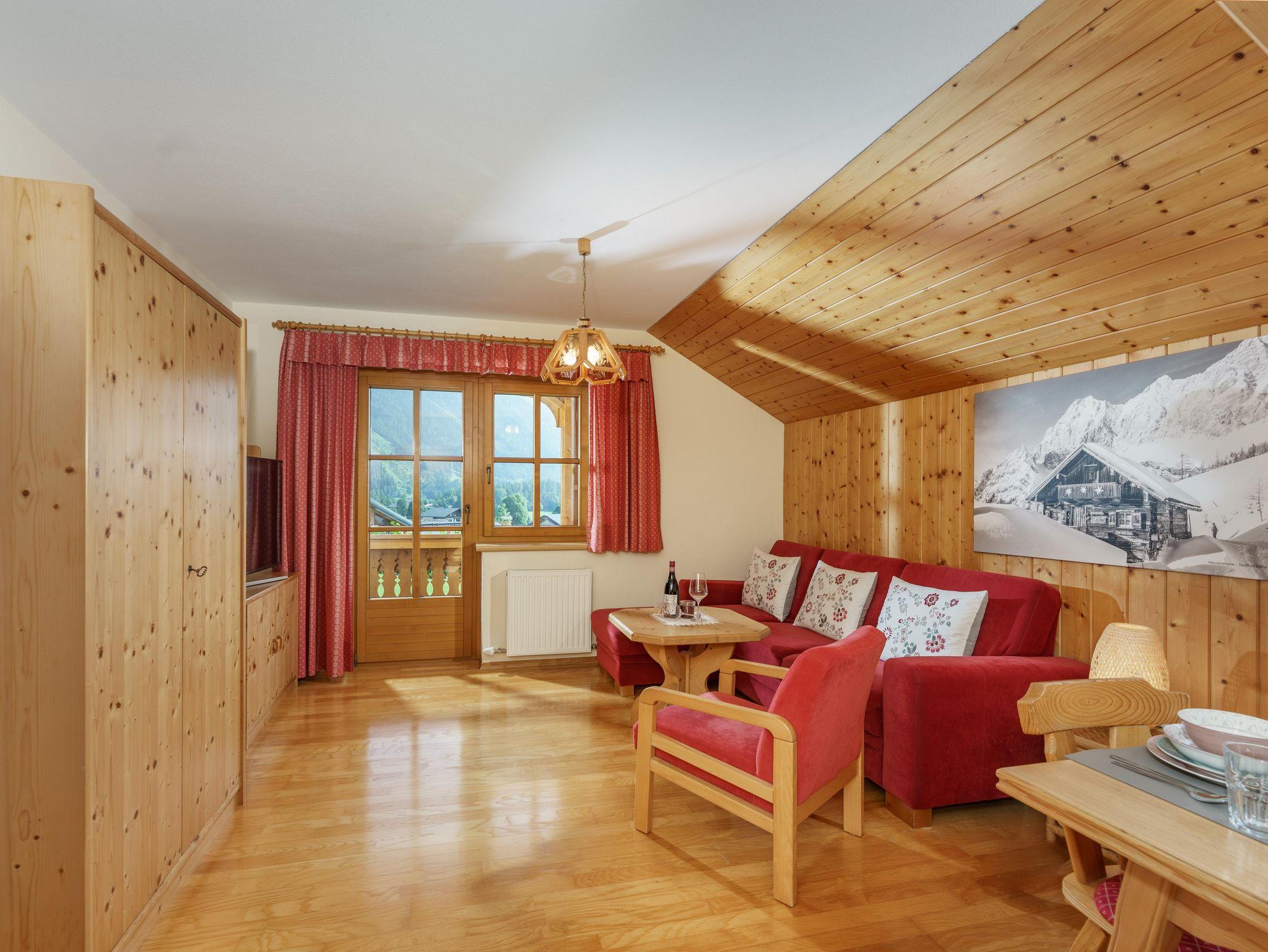 Sehr schönes, großes Appartement im 1. Stock. Das Appartement Hochsitz hat ca. 62 m² mit einem Vorraum, zwei Schlafzimmer, DU/WC getrennt und einem großen Wohnraum mit schöner Küchenecke und gemütlicher Wohnecke - Parkettböden ! Vom Wohnraum und von beiden Schlafzimmern aus erreicht man den großen, eigenen Holzbalkon in Nord-Ostrichtung - Blick auf die Berge des Dachsteinmassives- Sitzgarnitur und Liegestühle selbstverständlich vorhanden :) FLAT TV und Gratis W-LAN im Appartement.