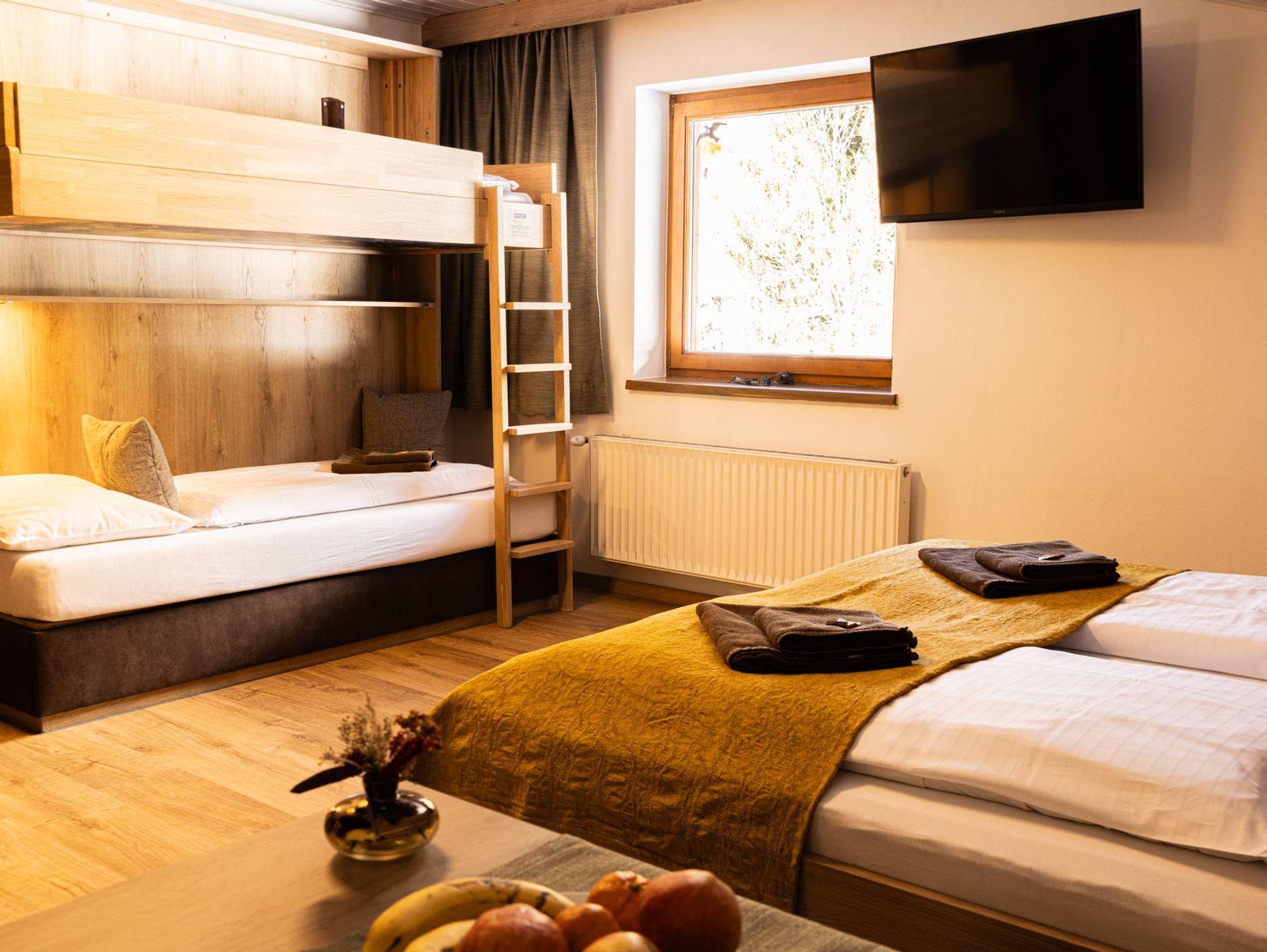 Ein Standard-Doppelzimmer kann als drittes Schlafzimmer verbunden werden : Standard Belegung 7 Personen, maximale Belegung 9 Personen.