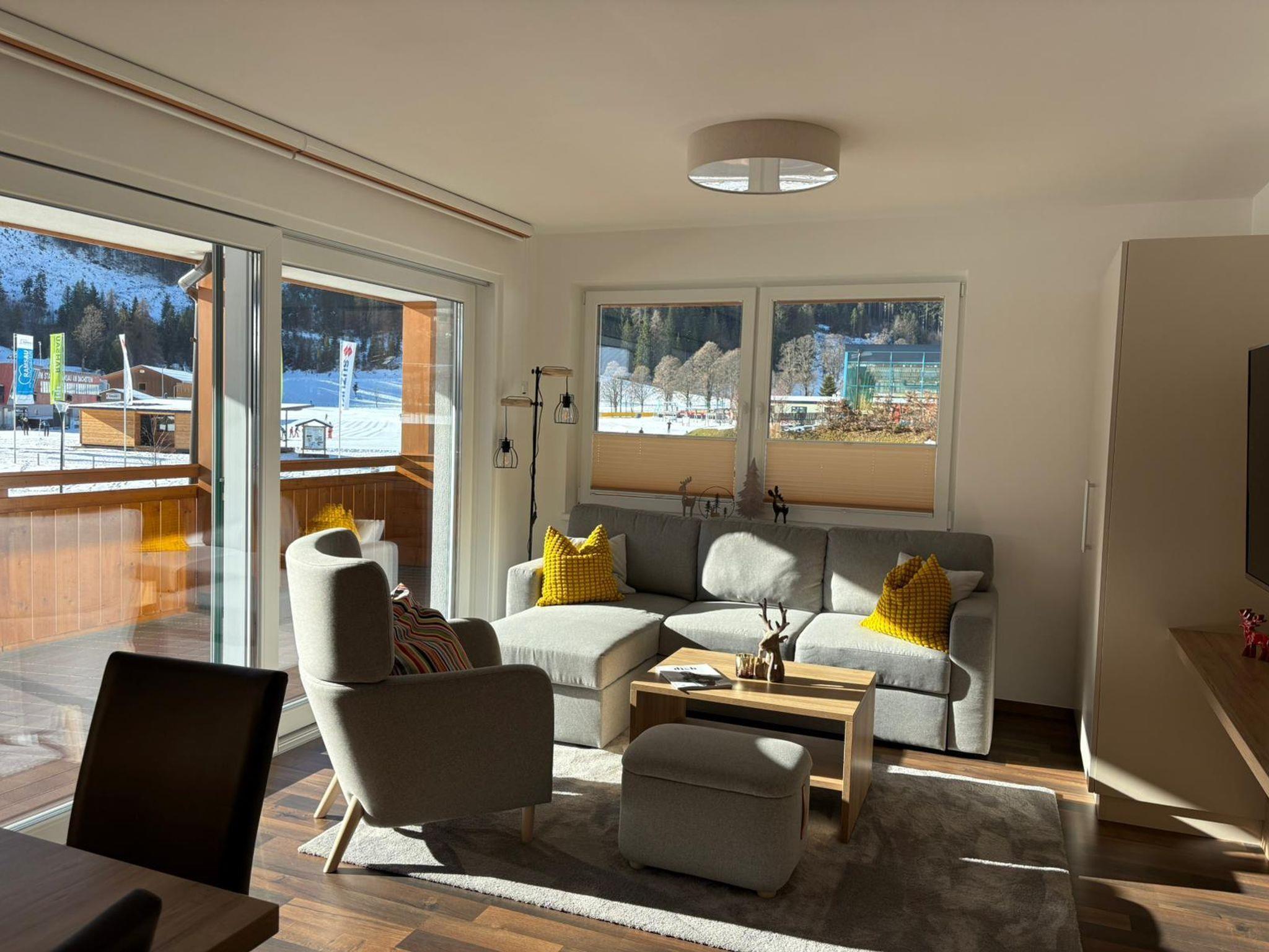 Unser Ramsaublick-Apartment überzeugt durch seine zentrale Lage und ein außergewöhnlich naturverbundenes Ambiente. Das moderne Apartment liegt direkt am Nordisches Trainingszentrum Ramsau am Dachstein und unmittelbar neben der Loipe mit einem beeindruckenden Panoramablick auf das Langlaufzentrum und die Skisprungschanze.