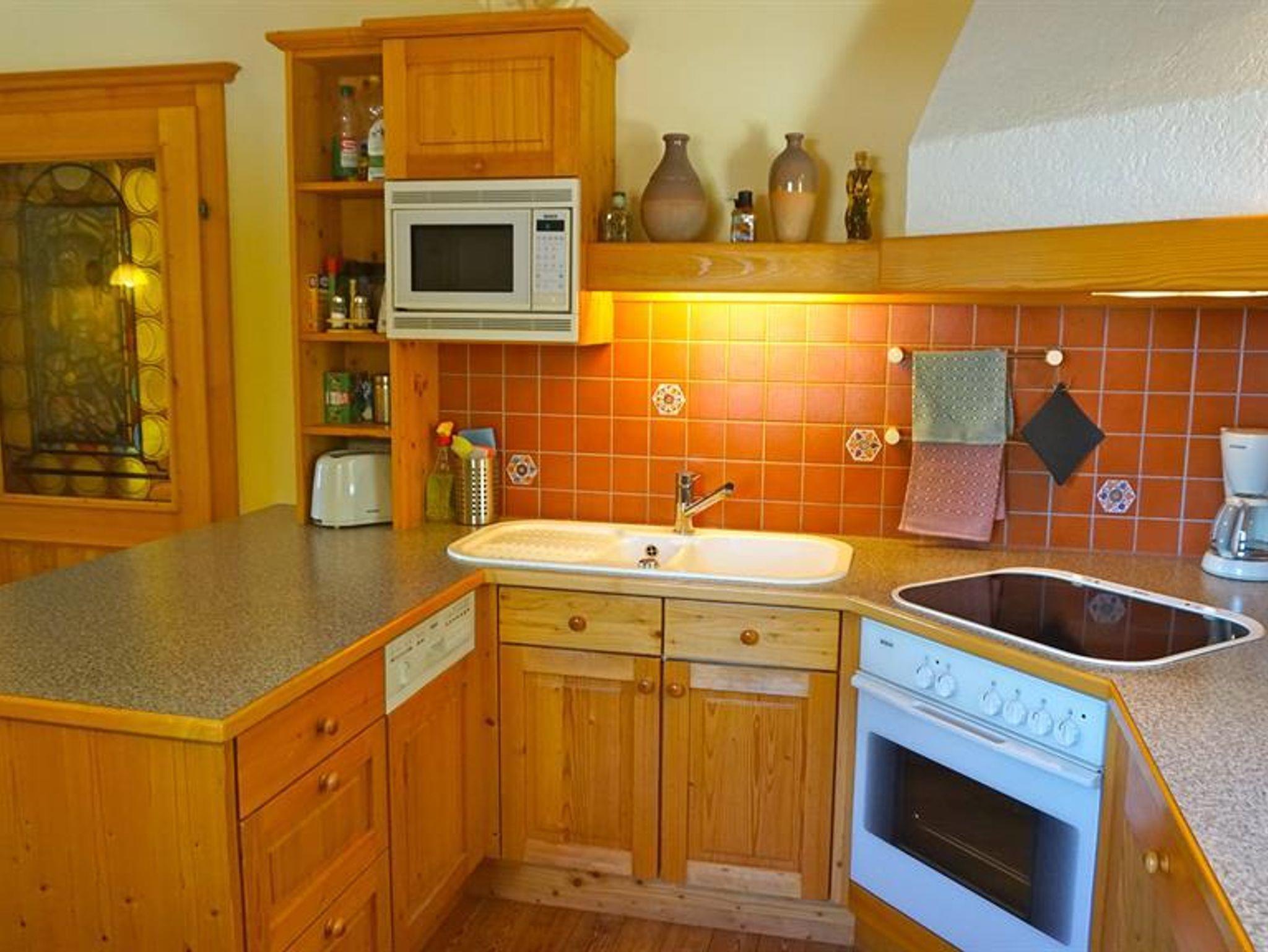 Einbauküche mit Spülmaschine, Kühlschrank mit Gefrierfach, Herd und Backofen, Mikrowelle und Kaffeemaschine.