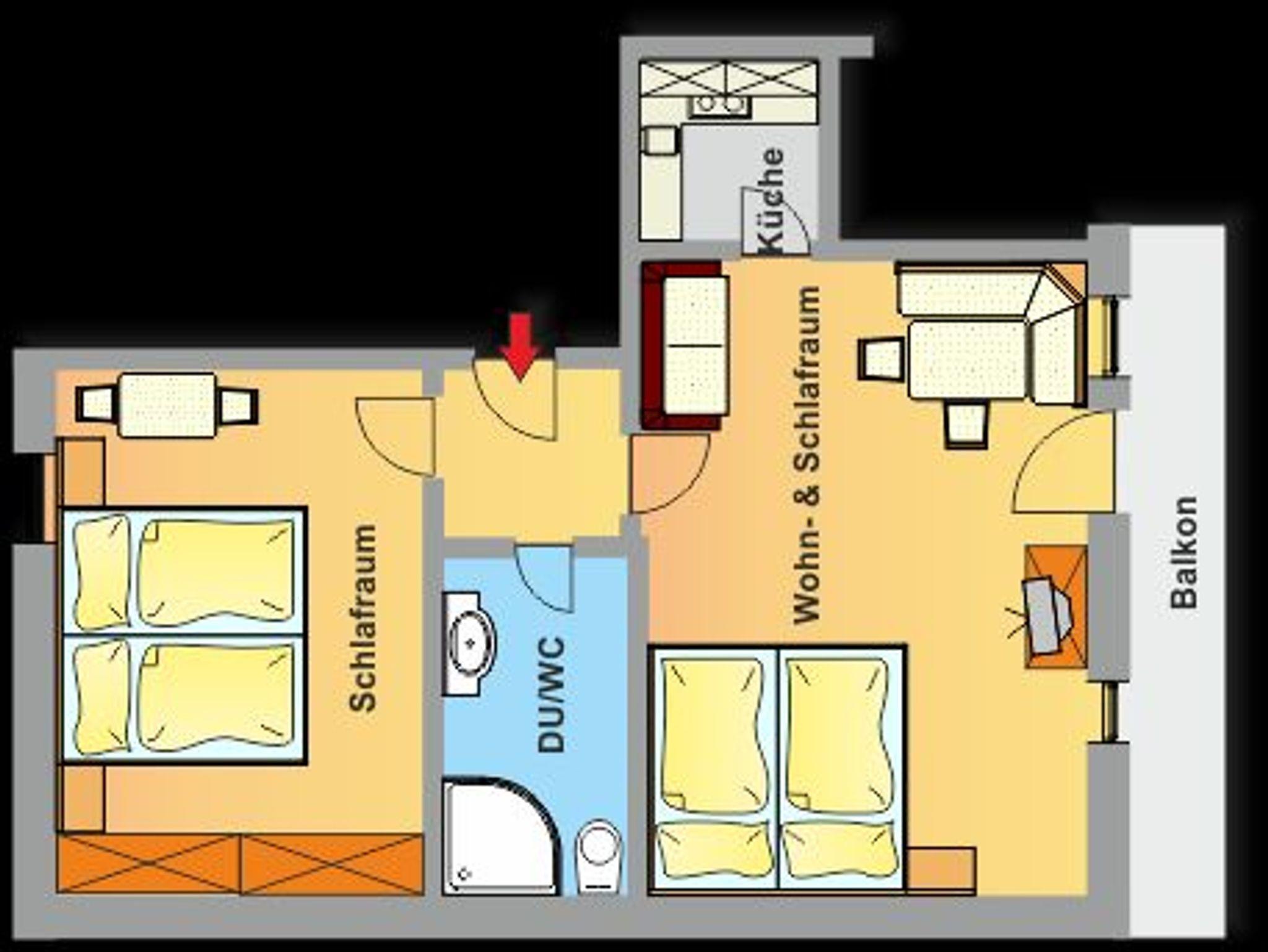 Ankommen und Wohlfühlen. Dieses voll ausgestattete Familienzimmer bzw. Appartement besteht aus einem Schlaf- und einem Wohnschlafzimmer mit Esstisch und ermöglicht ein komfortables Wohnen für 2 - 4 Personen. Eine eigene Küche, sowie der nach Süden ausgerichtete Balkon sind die Grundlage für angenehmen Wohnkomfort. Die Dusch/WC-Einheit ist von jedem Wohnraum aus separat erreichbar.