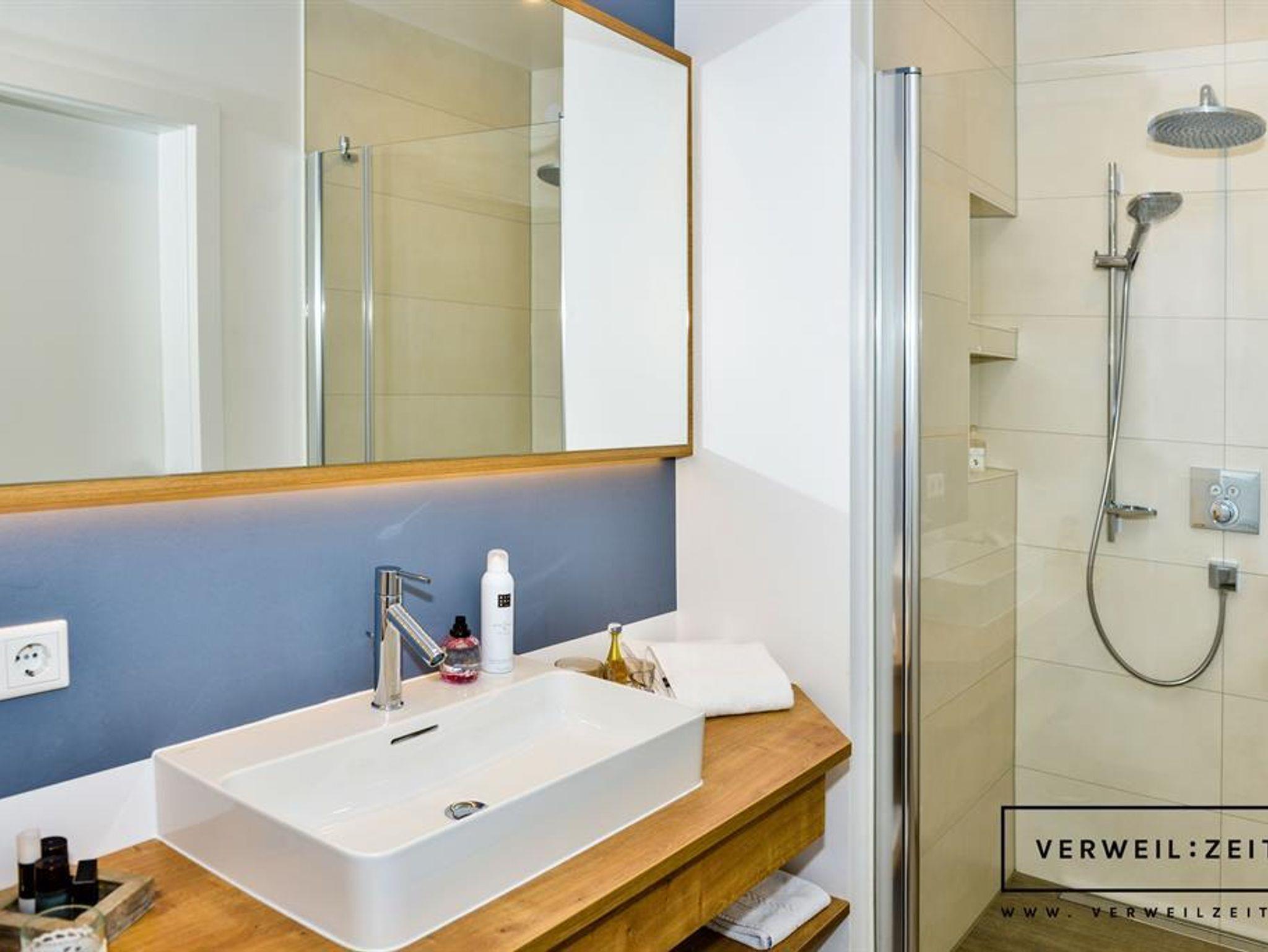 Unser Studio Apartment mit ca. 36m2 überzeugt mit einem modernen Charme in Blautönen. Es besteht aus einem Schlafzimmer mit Doppelbett und Echtholz Parkettboden, einer Wohn-Küche mit voll ausgestatteter Küche und einem Badezimmer mit Regendusche. Der Balkon ist Ostseitig zur Morgensonne gerichtet. Das Apartment befindet sich im ersten Stock.