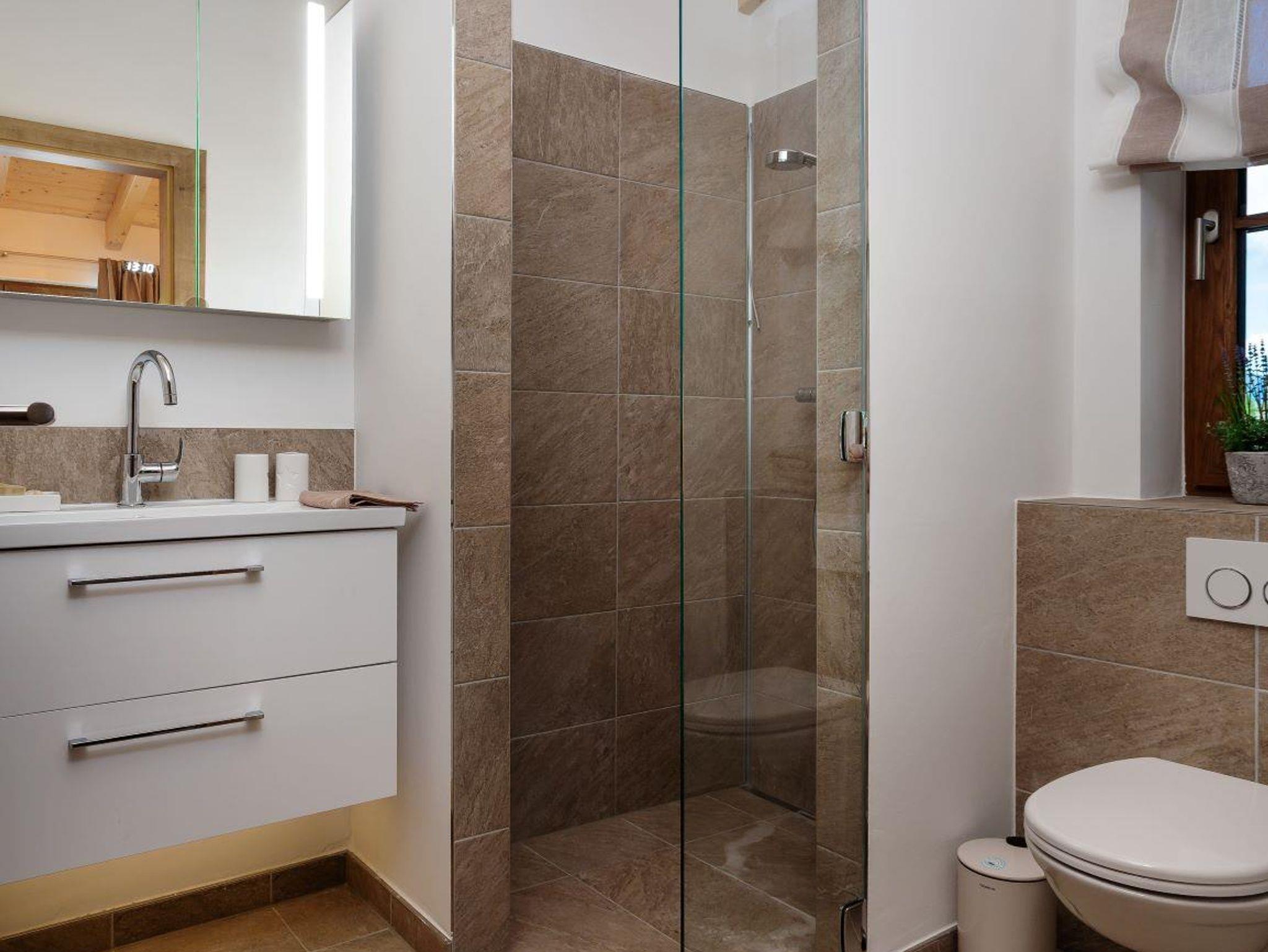 Im Obergeschoß befinden sich 3 Schlafzimmer mit Boxspringbett, Schrank, großem TV Flachbildschirm und jeweils einem Balkon. Darüber hinaus haben wir im Obergeschoß 2 moderne und gemütliche Bäder.