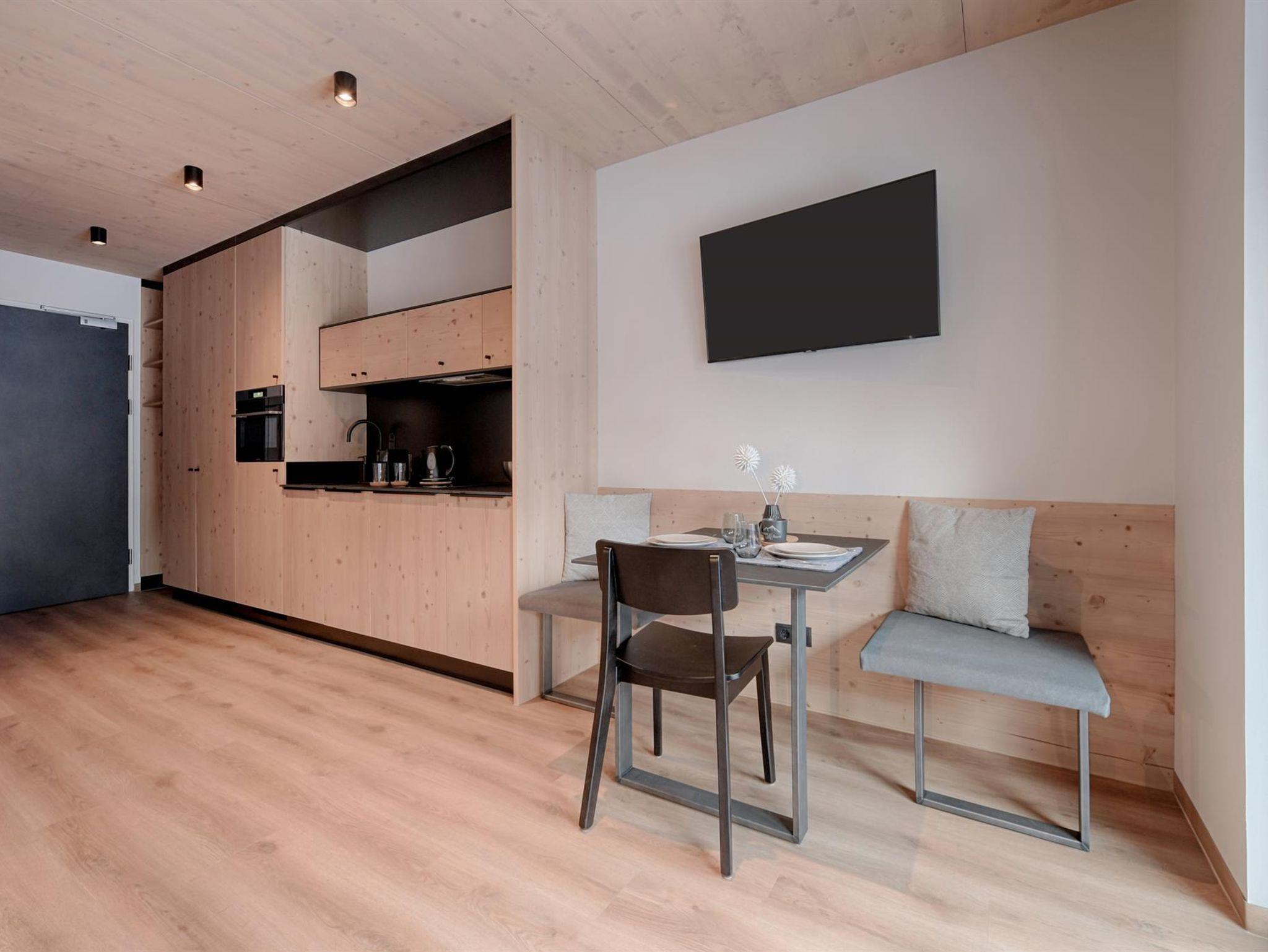Unsere großzügigen 1 Zimmer Apartments punkten mit trennbaren Doppelbett, gratis WLAN, neueste Technologie (elektronischem Zutrittssystem, mobiler Handy Schlüssel), großen Terrassen oder Balkonen und einem besonders angenehmen Raumklima durch den kompletten Massivholzbau.
