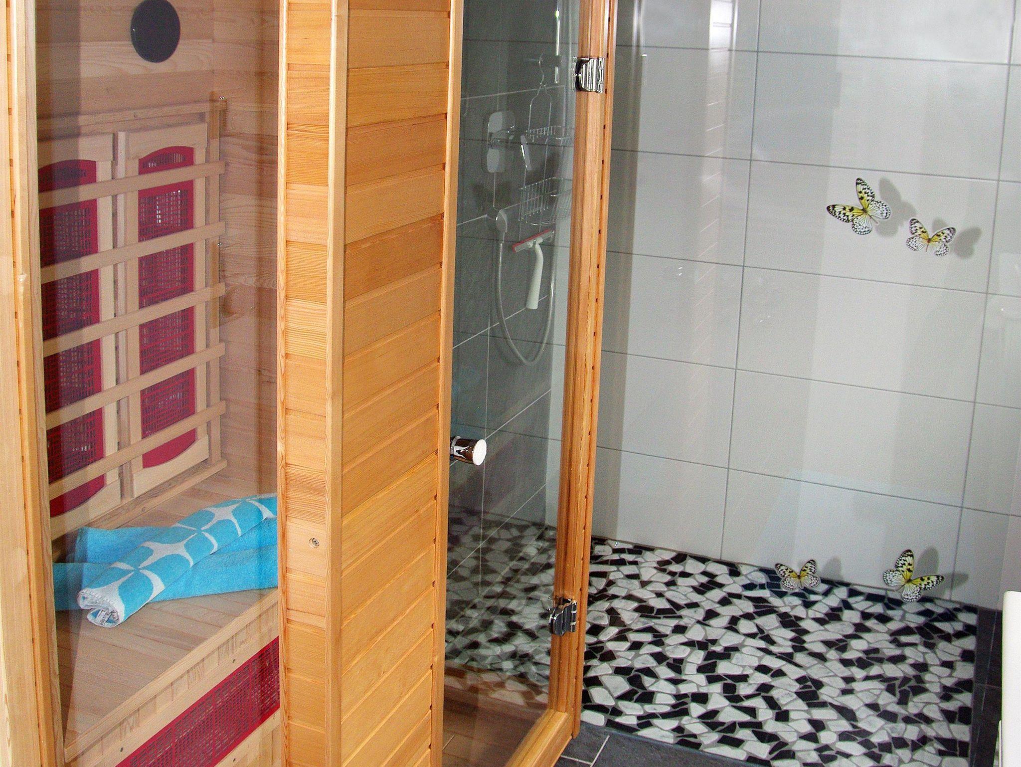 Das Badezimmer verfügt über eine begehbarer Dusche, einen elektronischen Handtuchtrockner und einer Infrarotkabine.