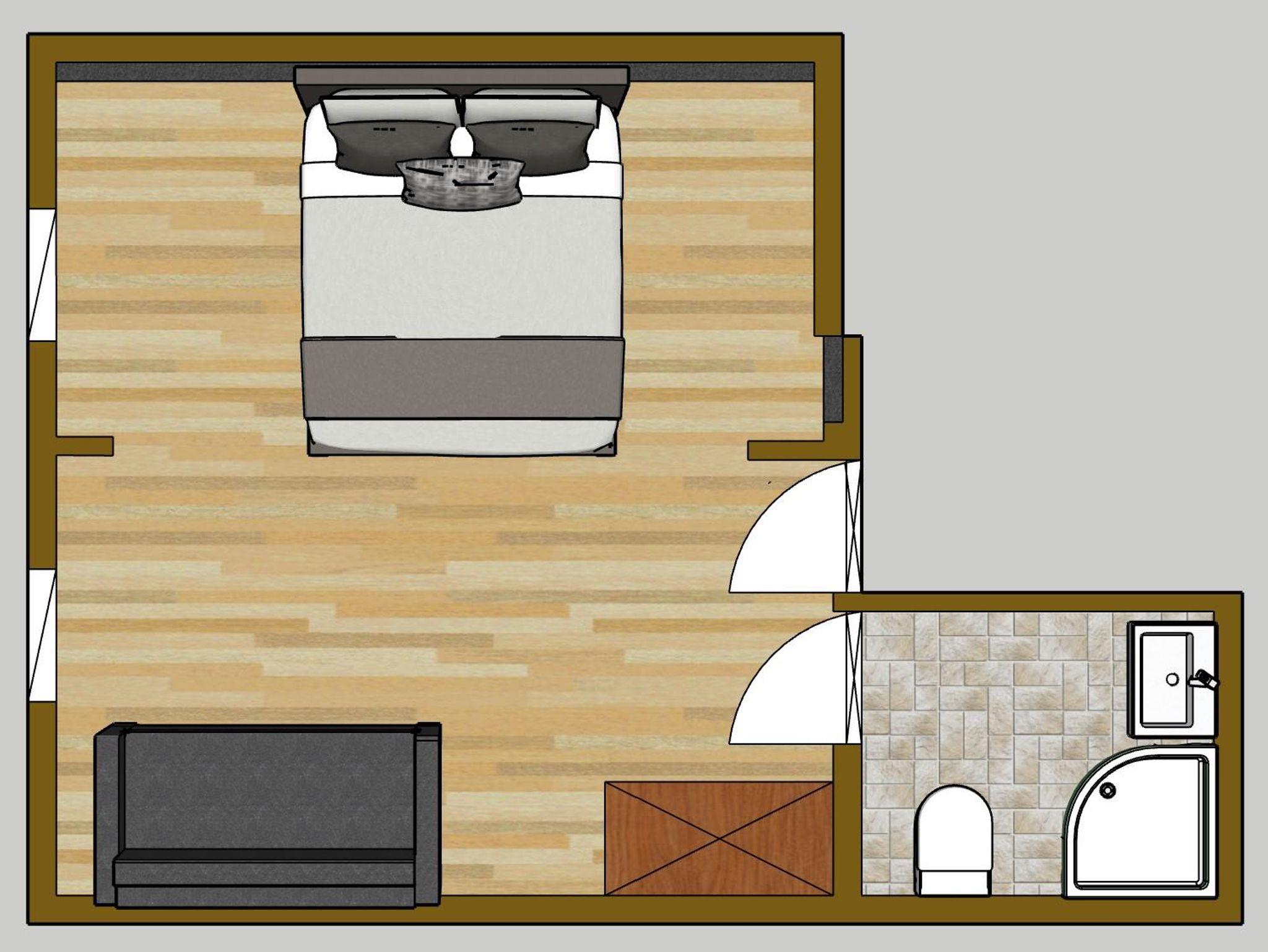 Dieses ruhig gelegene, geräumige Doppelzimmer befindet sich im zweiten Stock und verfügt über ein Badezimmer mit Dusche, Waschbecken und Toilette.