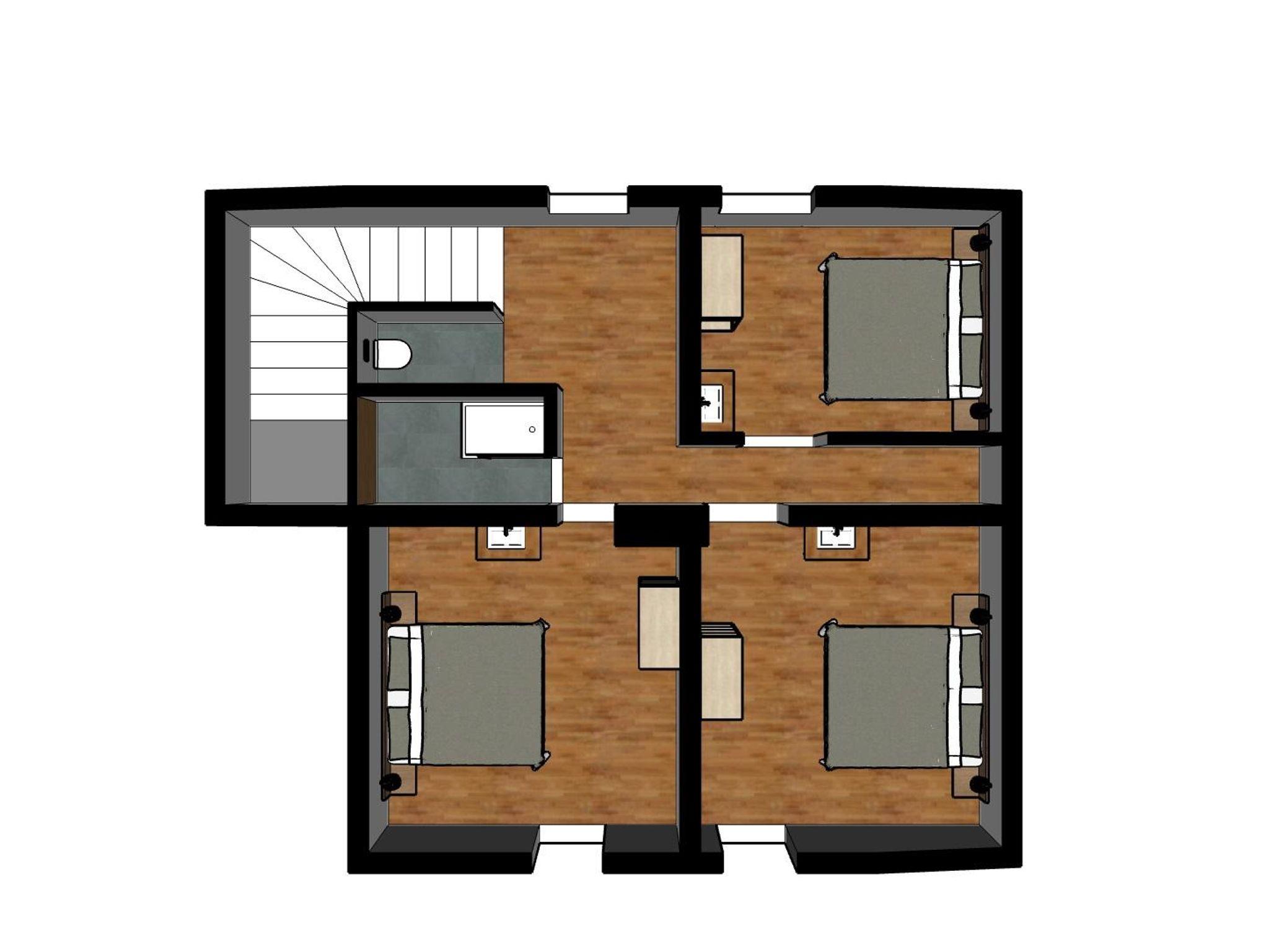 Auf der 2. Stock erwarten Sie drei weitere komfortable Schlafzimmer, die alle mit einem eigenen Waschbecken ausgestattet sind, um den Komfort zu erhöhen. Es gibt eine separate Dusche und eine weitere separate Toilette.