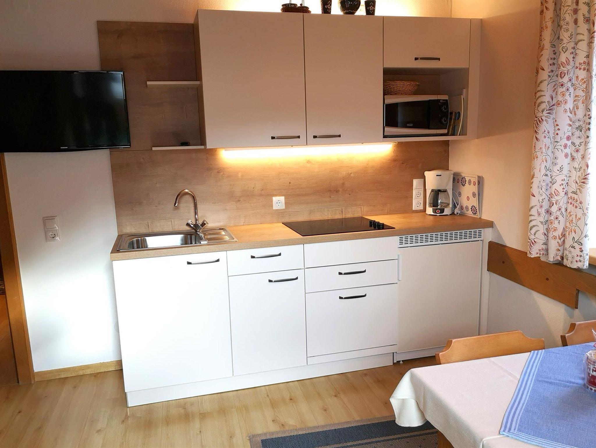 Gemütliches Appartement für 2-4 Personen (ca. 40 m2) Vorraum, Wohnraum mit Küchenzeile und Sitzbereich sowie eine ausziehbare Couch (Schlafgelegenheit für 1-2 Personen) und Flachbild-TV, Schlafzimmer mit Doppelbett, neu renoviertes Badezimmer mit Dusche, separate Toilette, gemütlicher möblierter Balkon Richtung Süden mit Rundumblick;