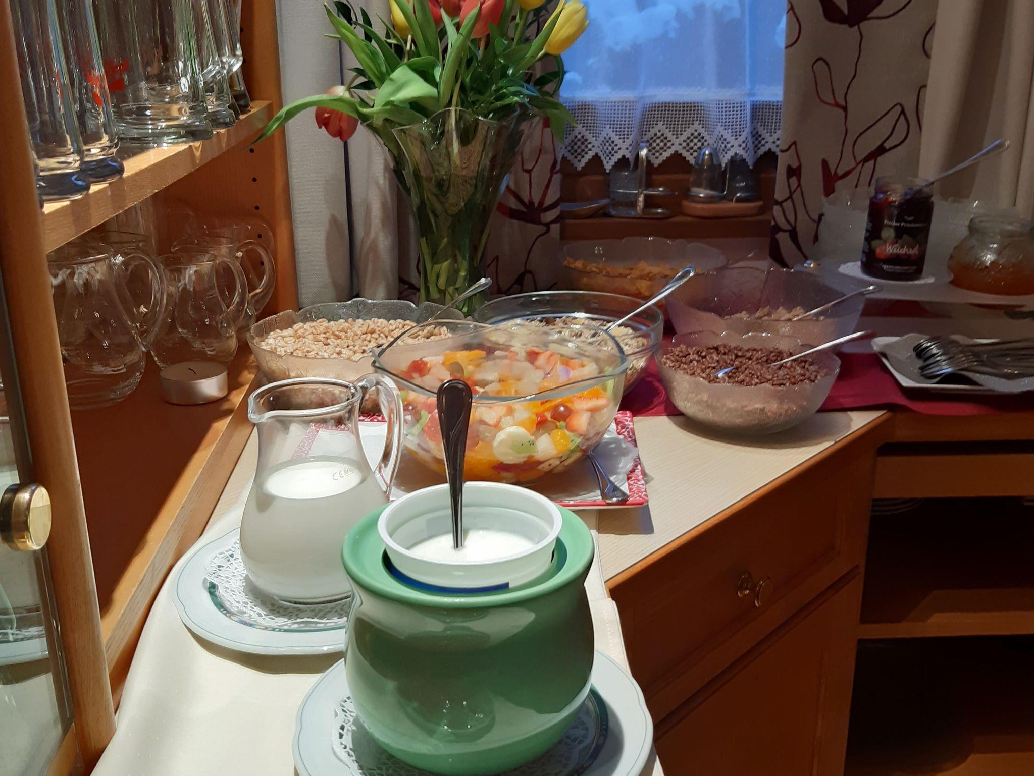 Reichhaltiges Frühstück mit Büffet im gemütlichen Gästestüberl.