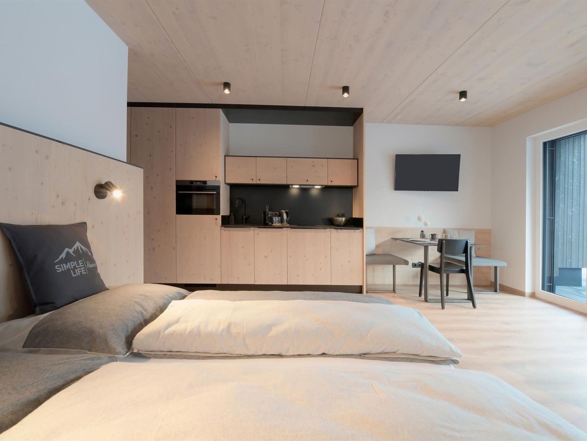 Unsere großzügigen 1 Zimmer Apartments punkten mit trennbaren Doppelbett, gratis WLAN, neueste Technologie (elektronischem Zutrittssystem, mobiler Handy Schlüssel), großen Terrassen oder Balkonen und einem besonders angenehmen Raumklima durch den kompletten Massivholzbau.
