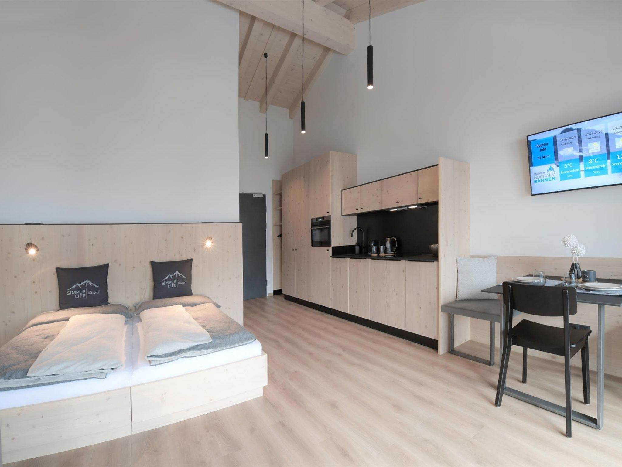 Der offene Wohn- und Schlafbereich, das Badezimmer und die vollfunktionale Küche lassen keine Wünsche offen – alles in klaren Formen und natürlichen Materialien gehalten.