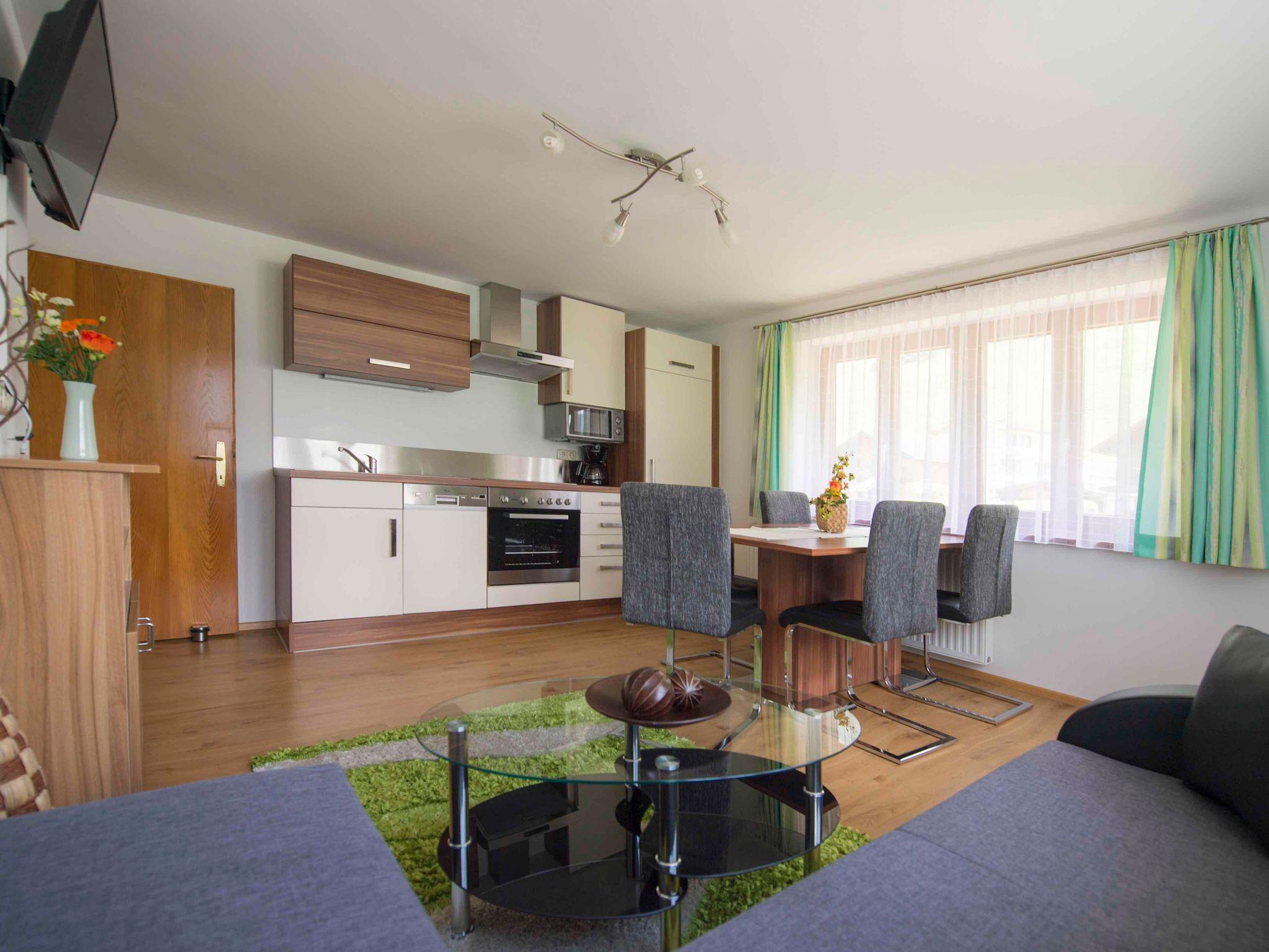 Beide verfügen über je zwei Schlafzimmer mit Doppelbett, Kleiderschrank und Garderobe, ein Badezimmer mit Dusche, Waschbecken und Toilette sowie einer geräumigen Wohnküche mit ausziehbarer Sofalandschaft, Essecke und Küchenzeile. Außerdem verfügt jedes Appartement über einen W-LAN- Anschluss und Kabel- TV. Bettwäsche, Handtücher, Badetücher, Haarföhn, Geschirrtücher, Koch- und Essgeschirr, Mikrowelle, Kaffeemaschine, Wasserkocher, Toaster, Backofen mit Ceran- Kochfeld, Kühlschrank mit Gefrierfach sind in den Wohnungen enthalten. Im Hauseingangsbereich befindet sich ein separater Schiraum mit Schuhtrockner. Auf Wunsch können Sie folgende Leistungen in Anspruch nehmen: - Kinderbett - Hochstuhl - Brotservice Preis für Hund pro Tag € 5,-