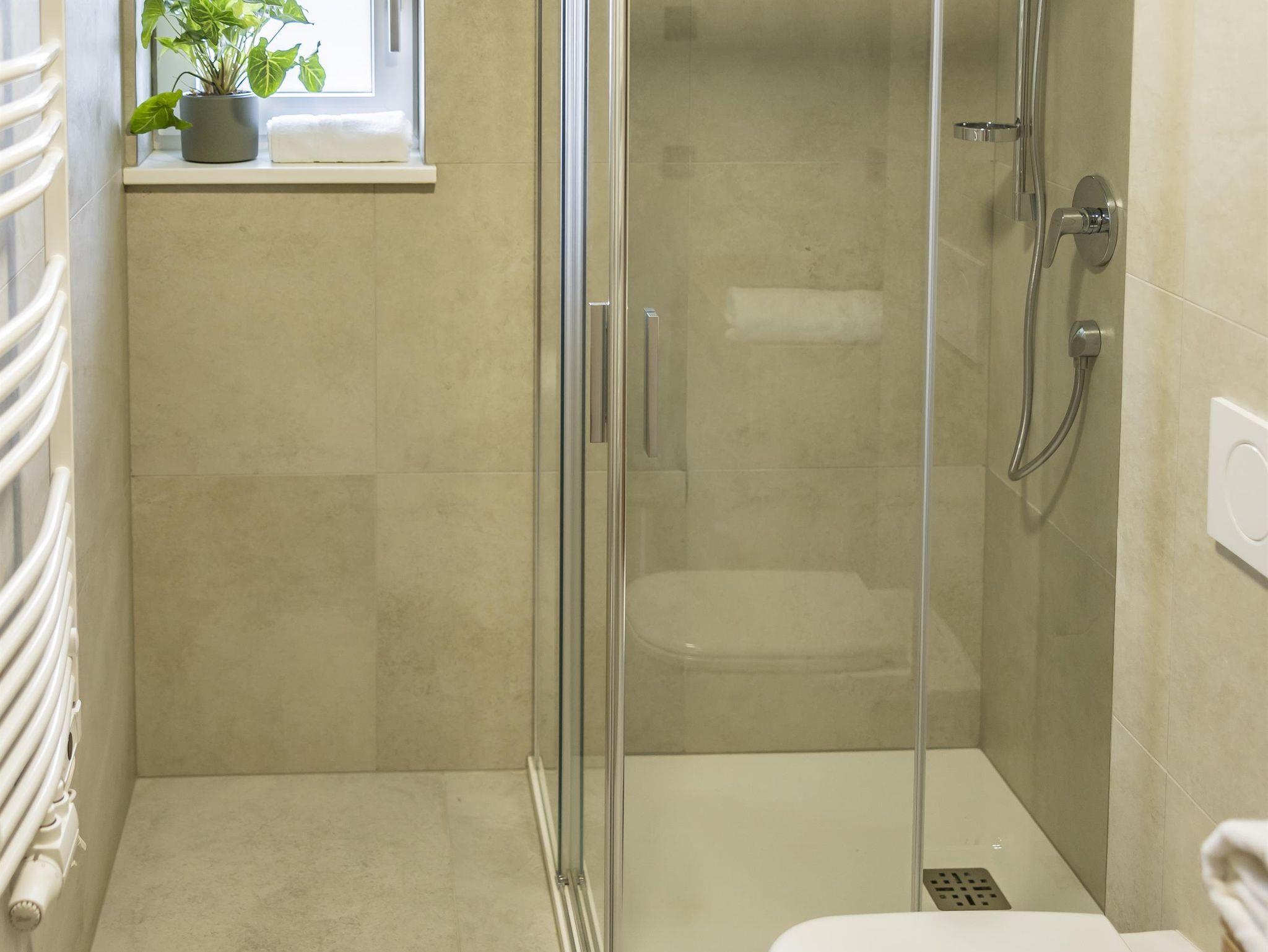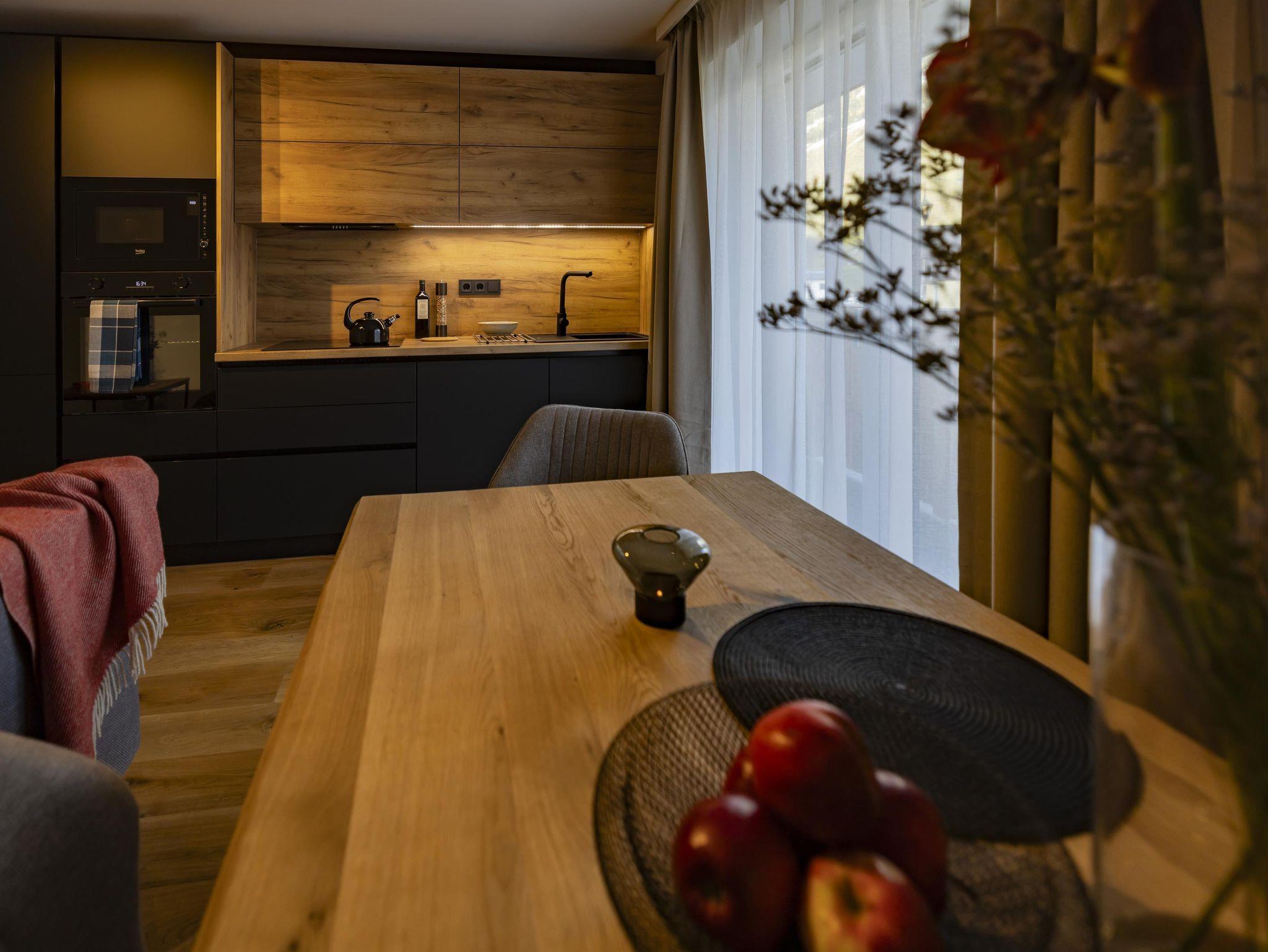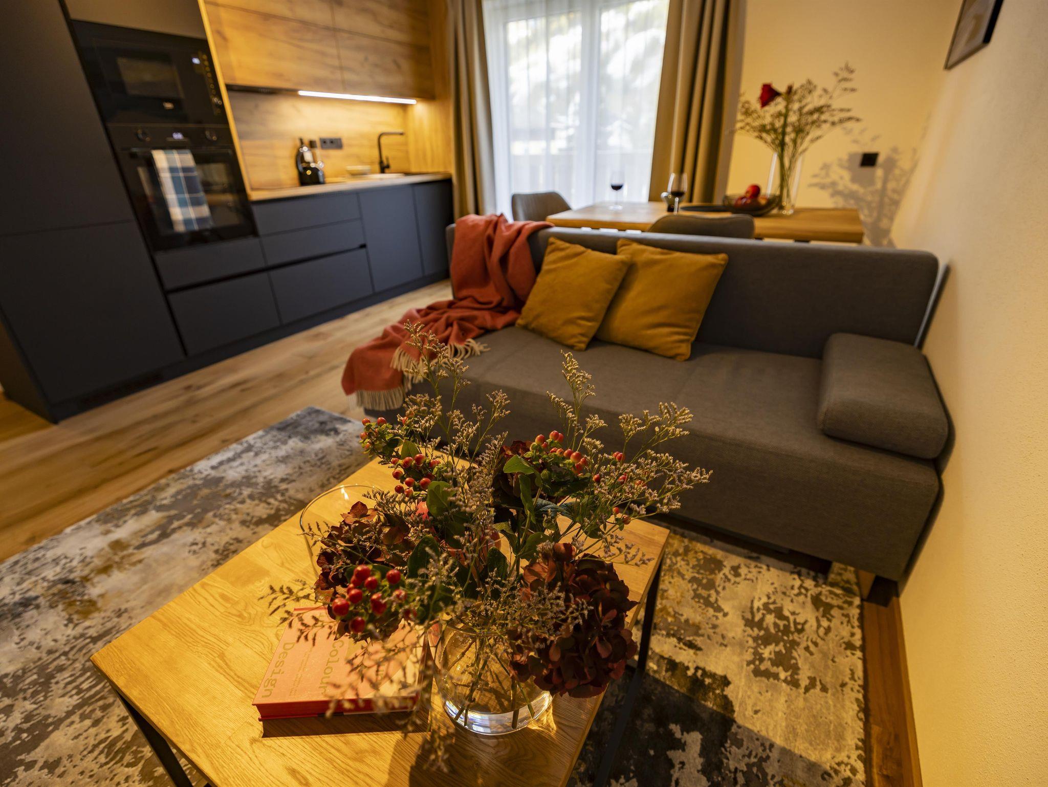 Im ersten Stock des Appartementhauses erwartet Sie eine schöne Wohnung, in der Sie von jedem Zimmer aus auf einen großzügigen Balkon treten und mit Blick auf die schneebedeckten Gipfel der Alpen entspannen können. Zwei getrennte Schlafzimmer mit Doppelbetten, ein geräumiges Badezimmer mit WC und eine gemütliche Küche mit Wohnzimmer garantieren maximalen Komfort für bis zu 6 Personen.