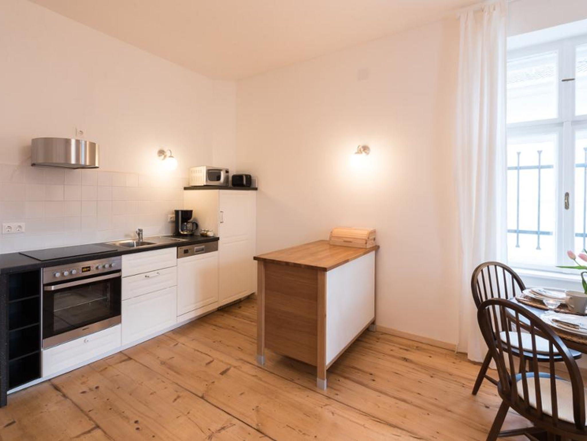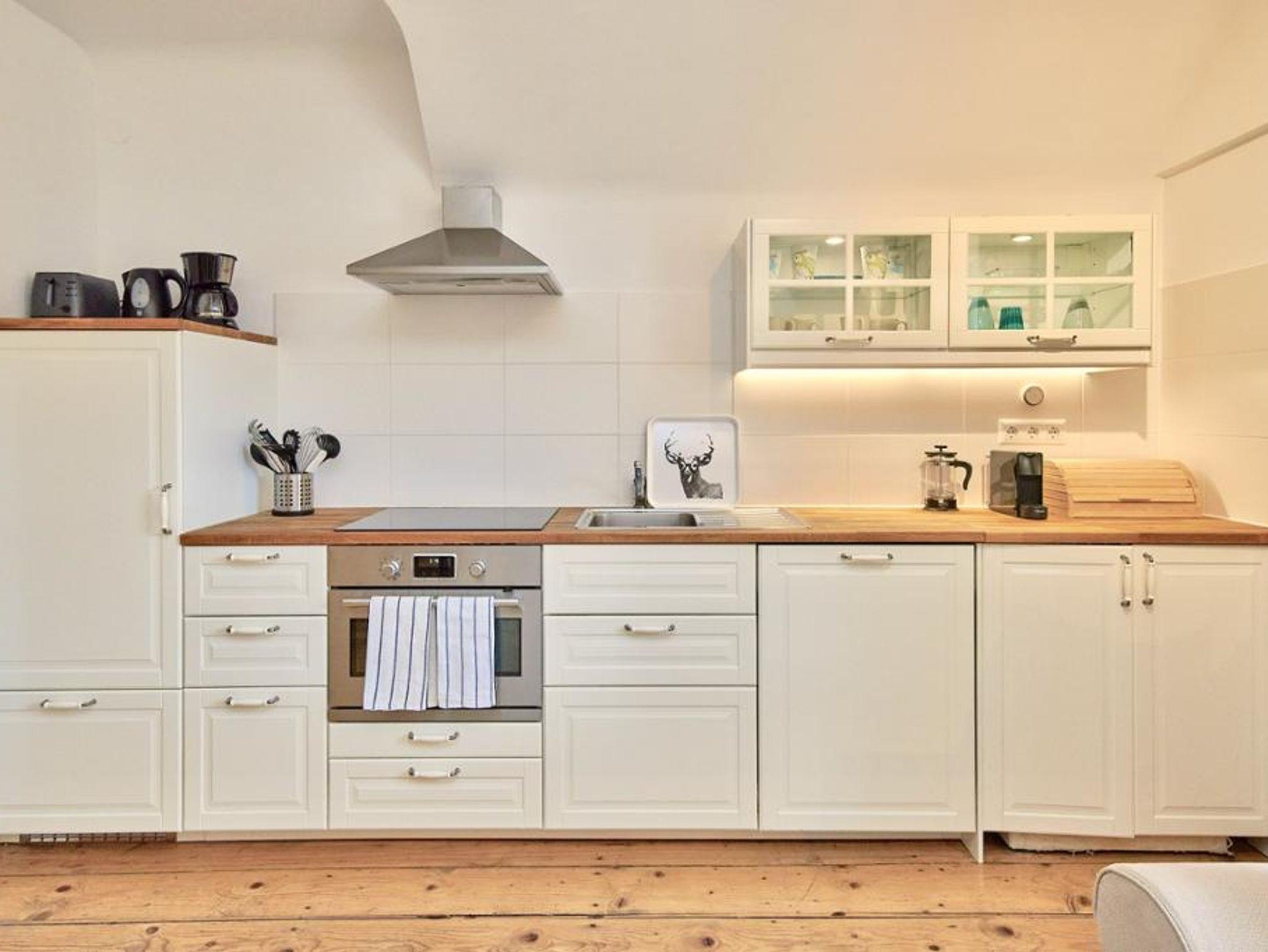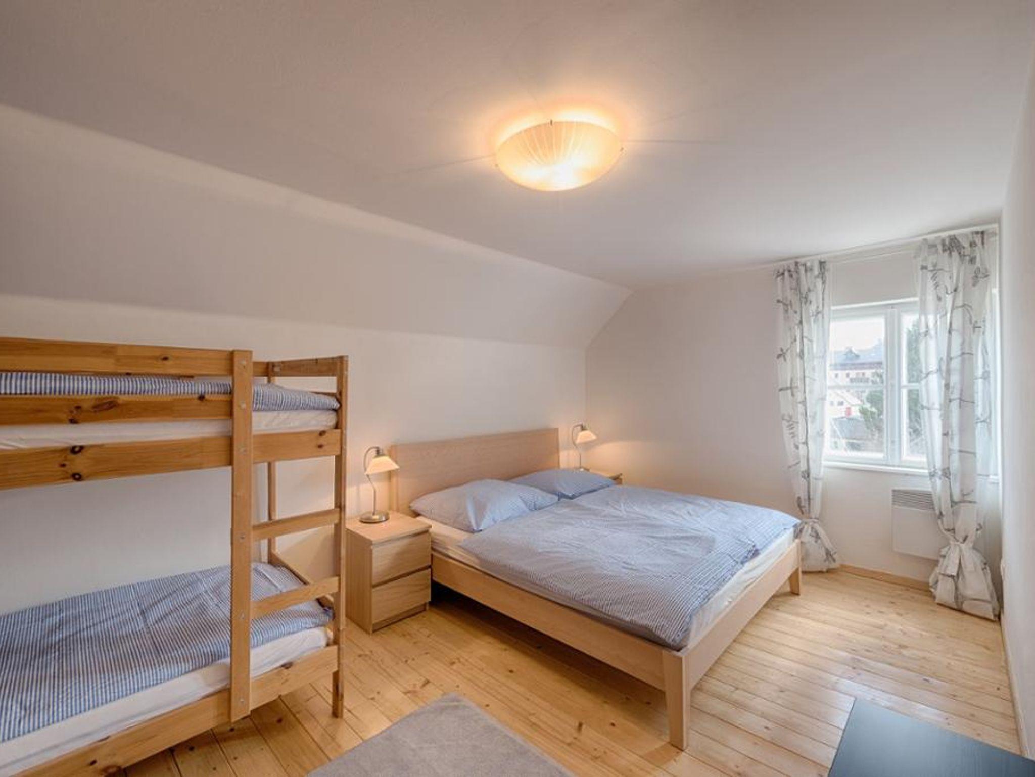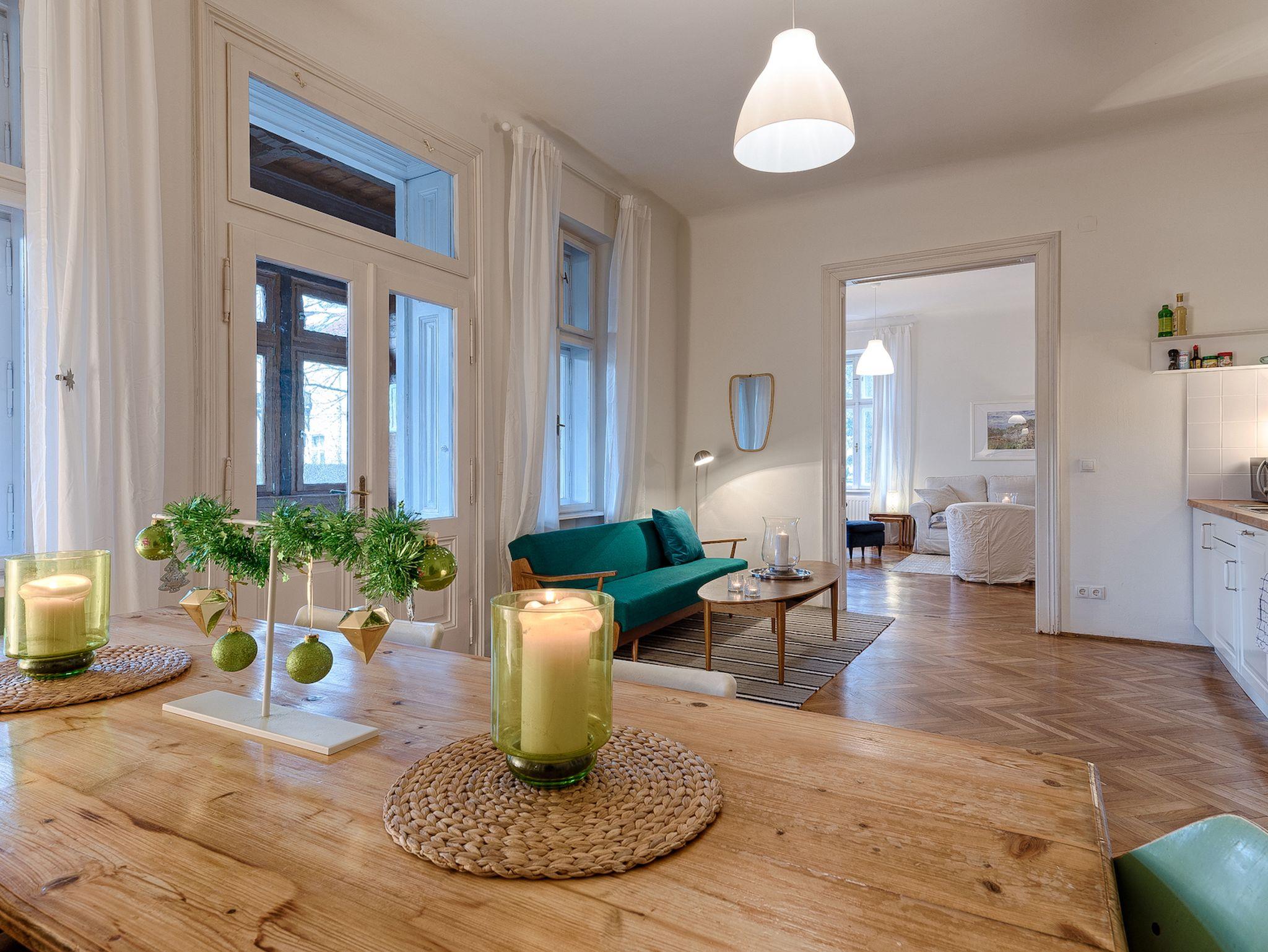 Diese im Hochparterre gelegene 100m2 Wohnung bietet Ihnen zwei Schlafzimmer (1 mit Doppelbett, 1 mit Stockbett), ein großes Wohnzimmer mit Doppelschlafcouch, eine große Wohnküche mit Pelletofen sowie Zugang zum Wintergarten. Dazu ein Badezimmer mit Badewanne, Fußbodenheizung sowie Waschmaschine und Trockner. Separat die Toilette. Flachbildschirm mit SAT-Anschluss und DVD-Player sowie eine Auswahl von Filmklassikern für verregnete Abende. Ausgestattet mit edlen Parkettböden, gemütliche Sofas und Lesesessel.