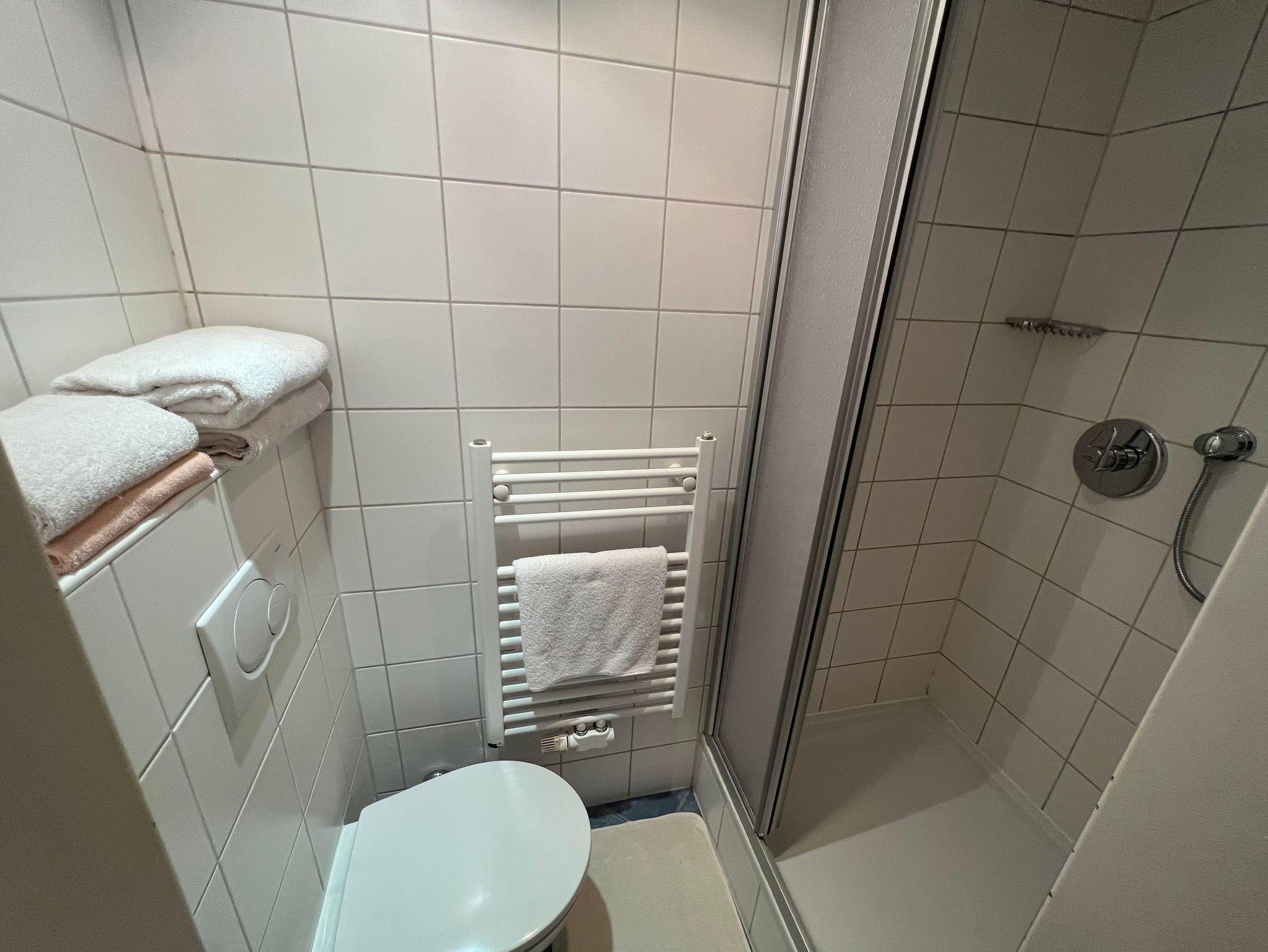 Das mit Dusche und WC ausgestattete Doppelzimmer ist durch einen offenen Durchgang mit dem gemütlichen Wohnbereich verbunden.