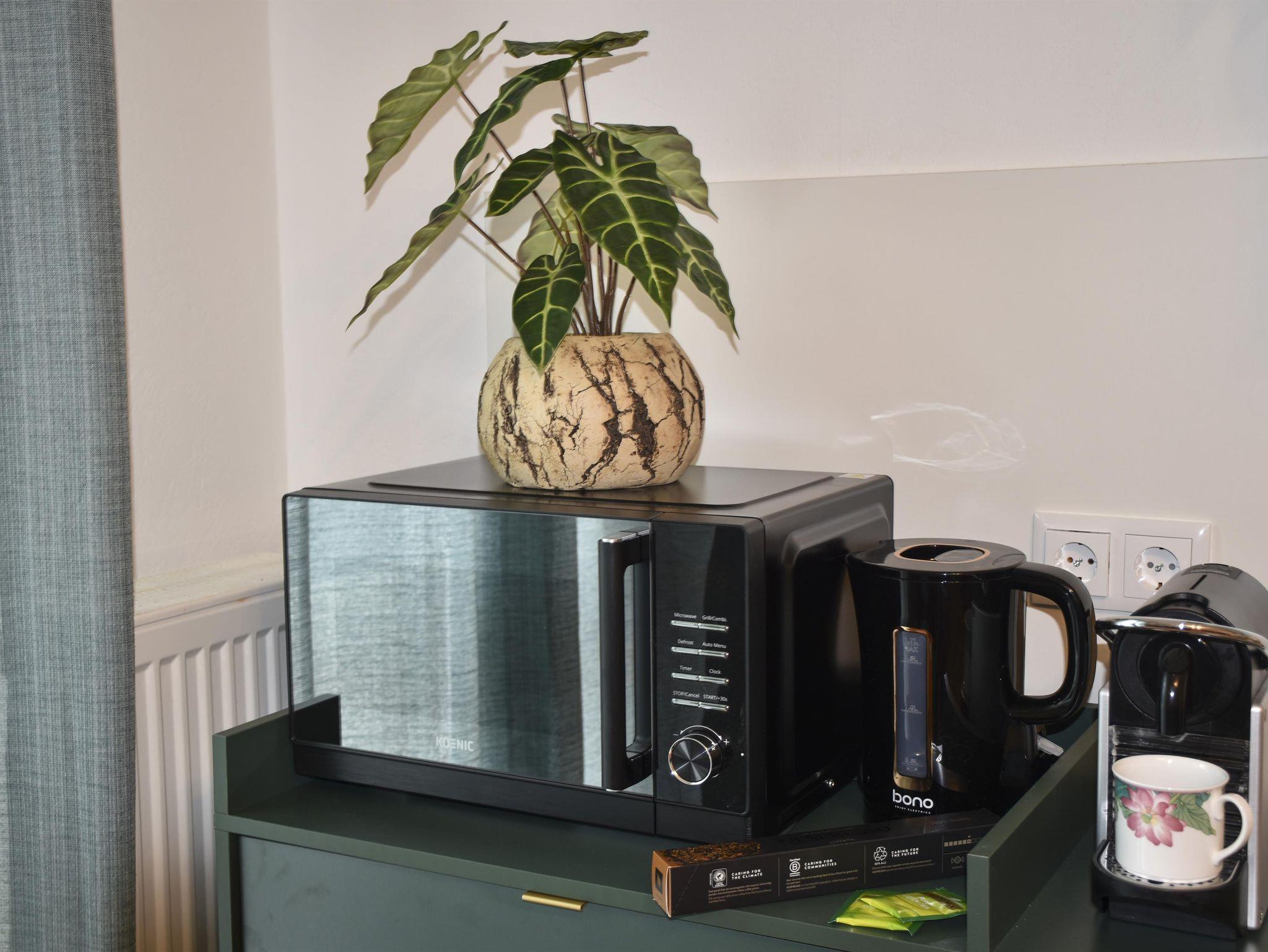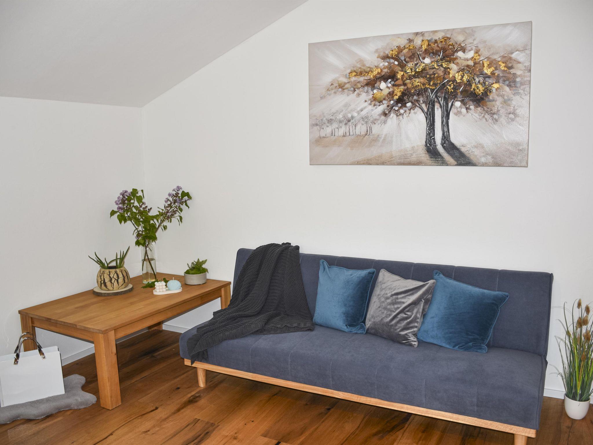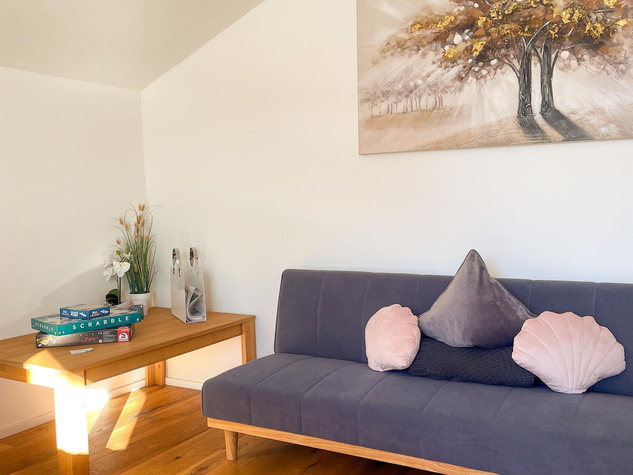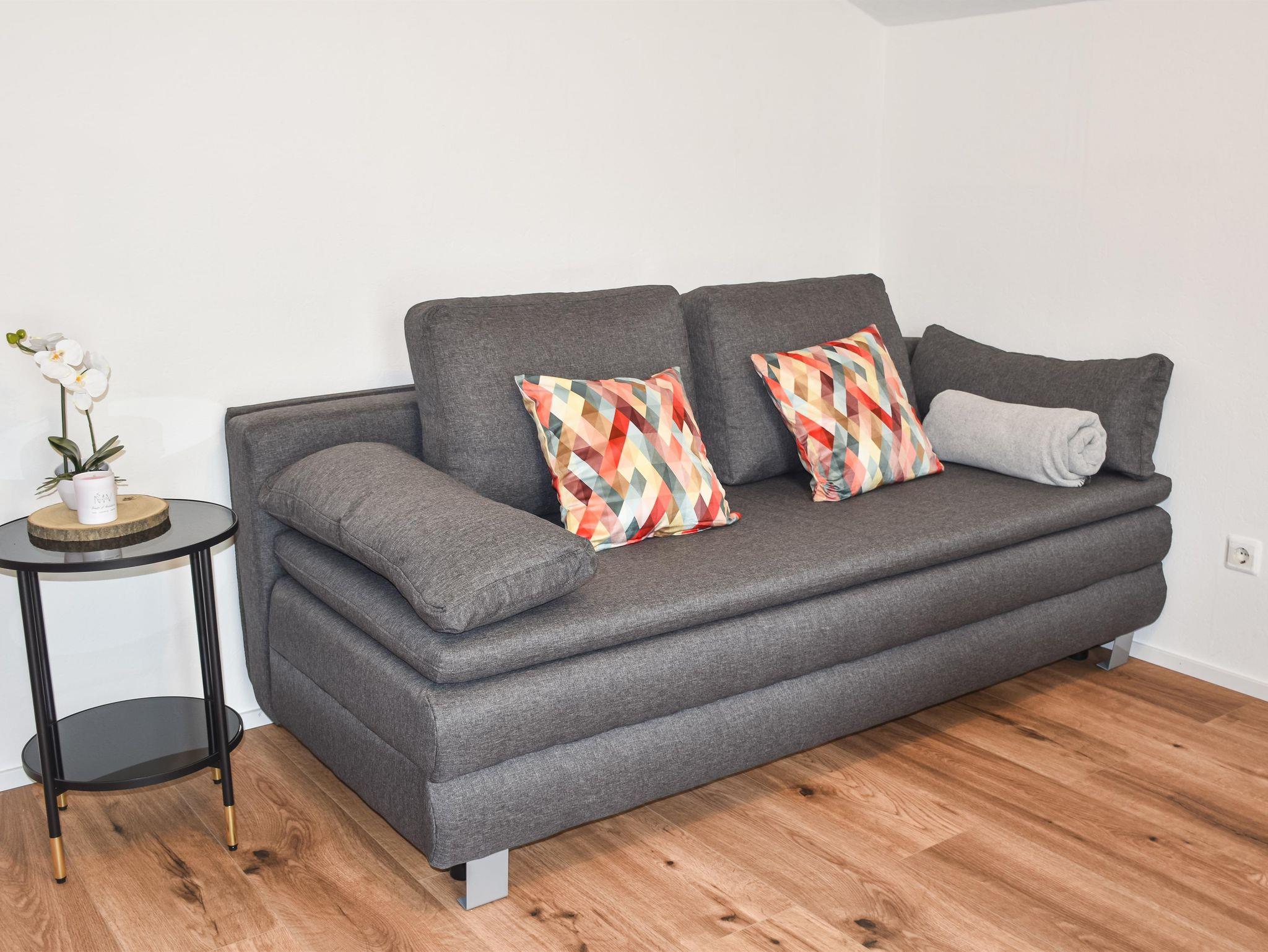 Küche/Wohnzimmer: Voll ausgestattete Küchenzeile: zwei Herdplatten, Kühlschrank mit Gefrierfach, Mikrowelle, Wasserkocher, Toaster und Nespresso-Kaffeemaschine. Ausziehbare Couch mit Schlafmöglichkeit für 2 weitere Personen.