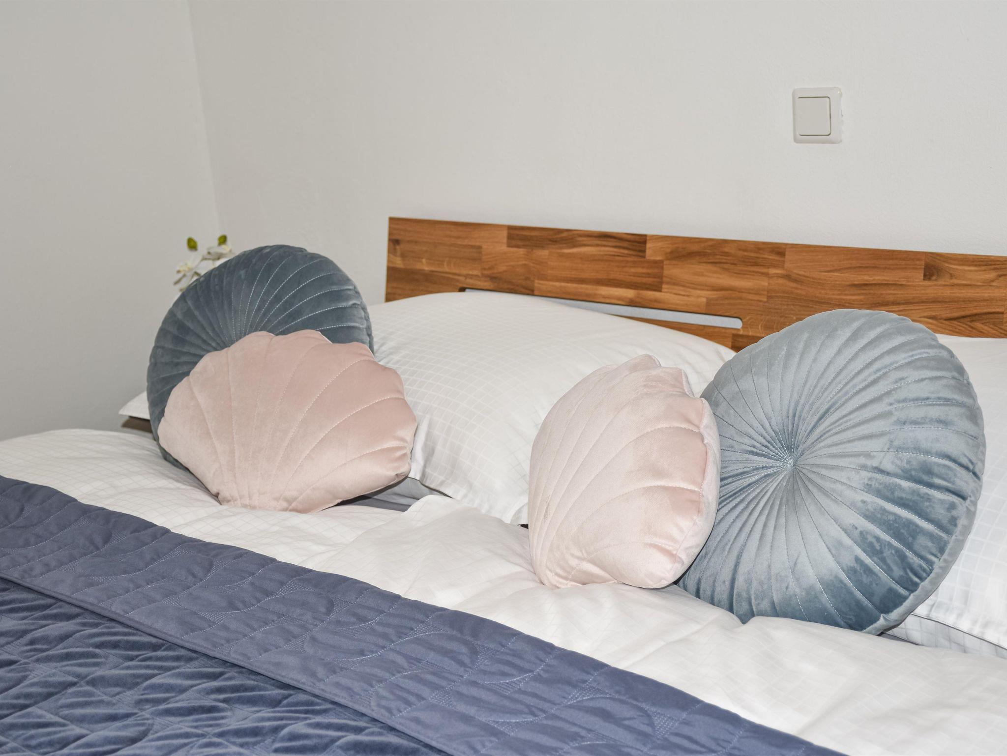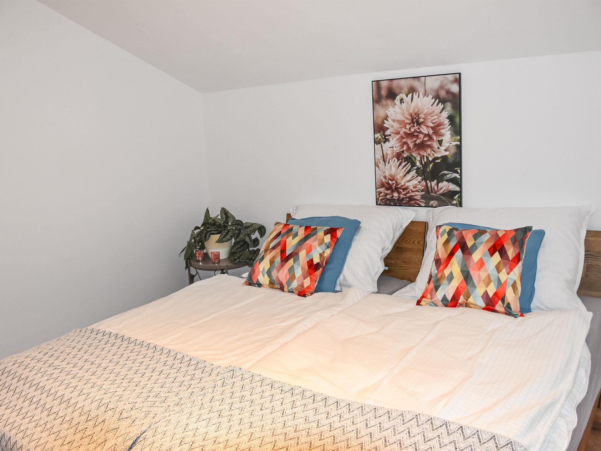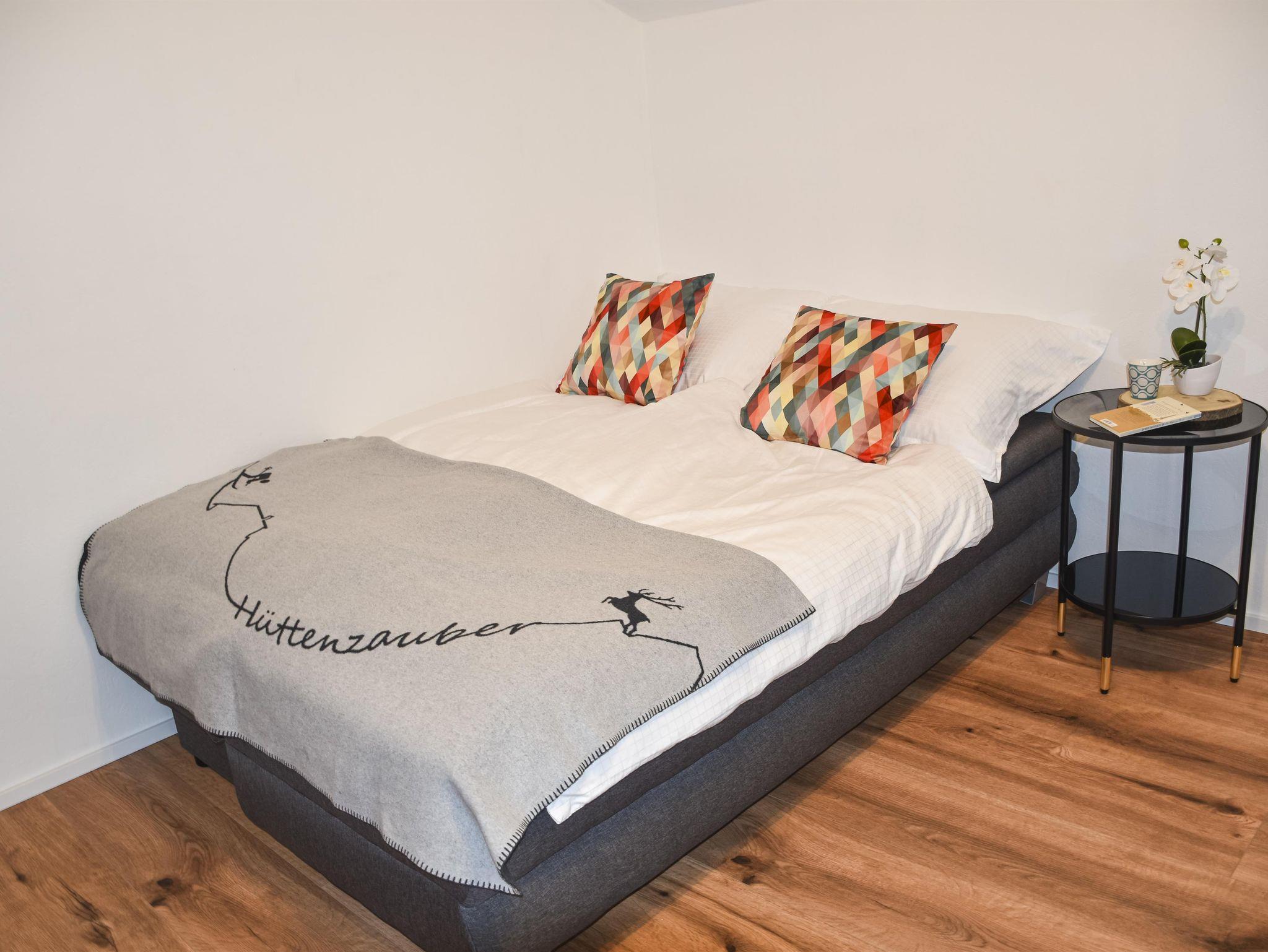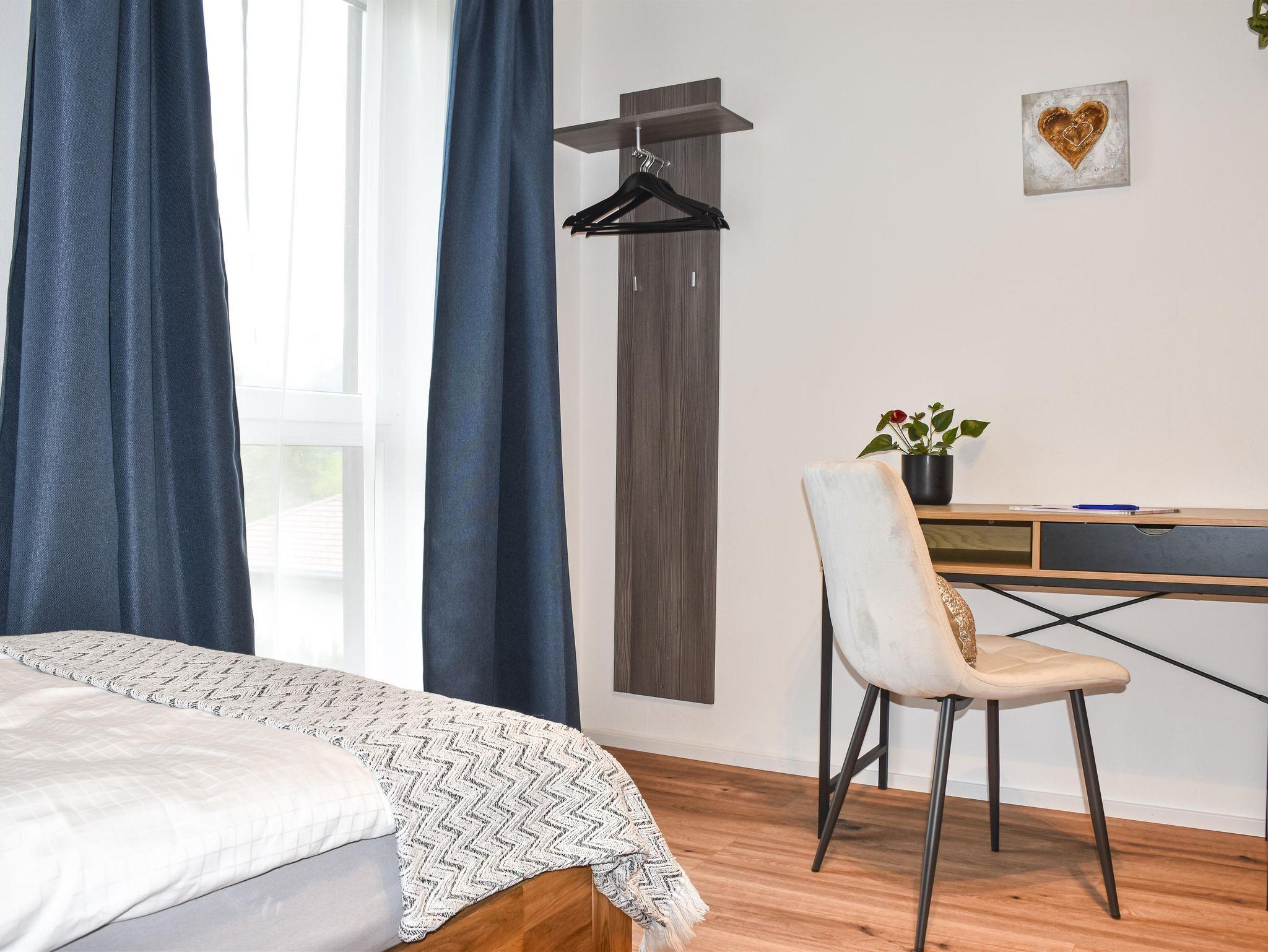 Das 1. Schlafzimmer ist mit Doppelbett, Schrank, Arbeitsplatz und einer Couch ausgestattet.