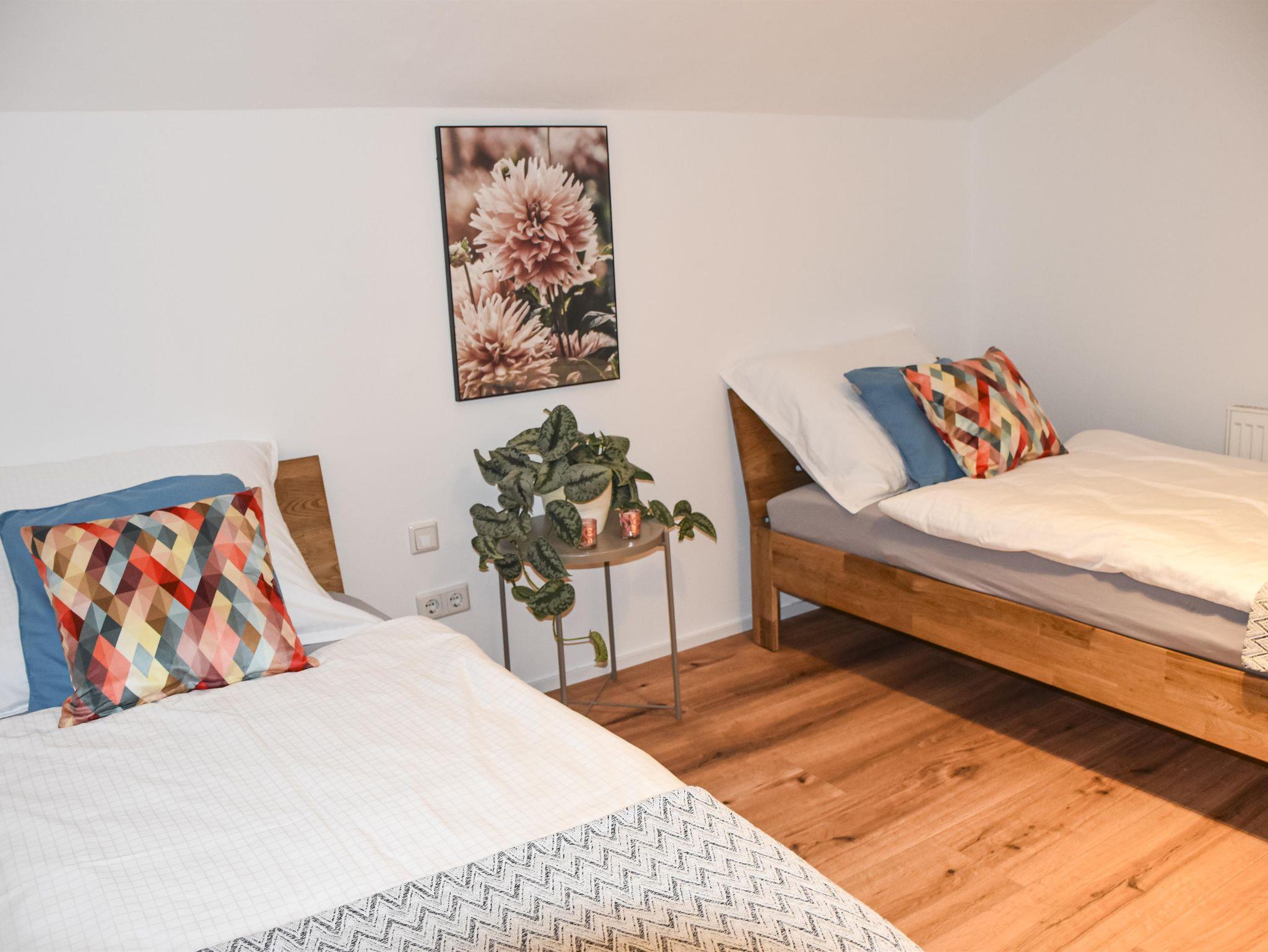 Das 2. Schlafzimmer verfügt über 2 Einzelbetten, die zusammengestellt werden können, sowie einen weiteren Arbeitsplatz.