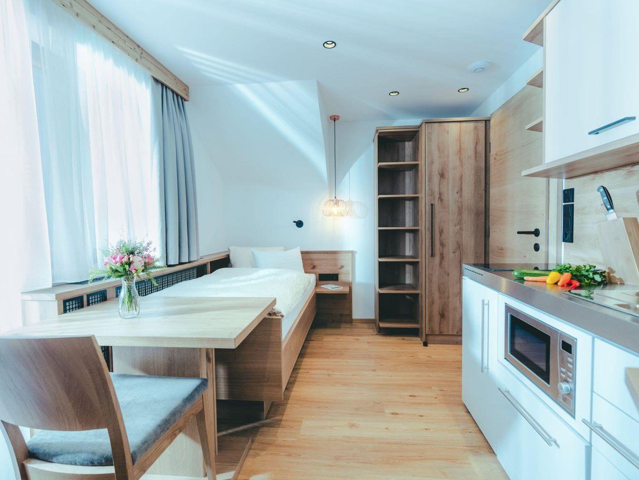 Die komplett renovierte Ferienwohnung Rosskopf im das Luggi (Umbau Herbst 2021) ist für eine Person und liegt im 2.Stock, hat ca. 16 m² und ist mit einem netten Wohn-Schlafraum mit Küche, TV, DU/WC und einem Balkon ausgestattet.