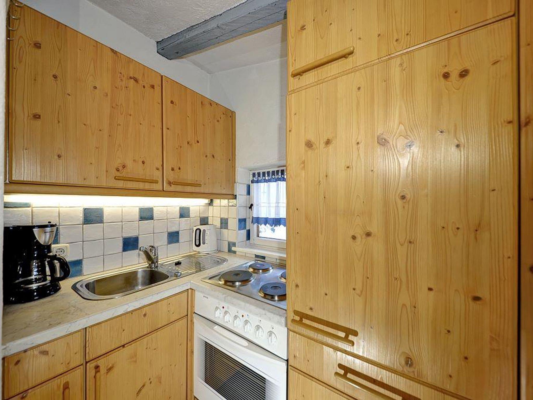 Die Wohnung umfasst einen Wohnraum mit Eckbank und Bauerntisch für 2 Personen, einen Schlafraum für 2 Personen (Einzelbetten), eine kleine Küche mit E-Herd und Kühlschrank (keine Spülmaschine), ein Bad mit Dusche, Waschbecken und WC.