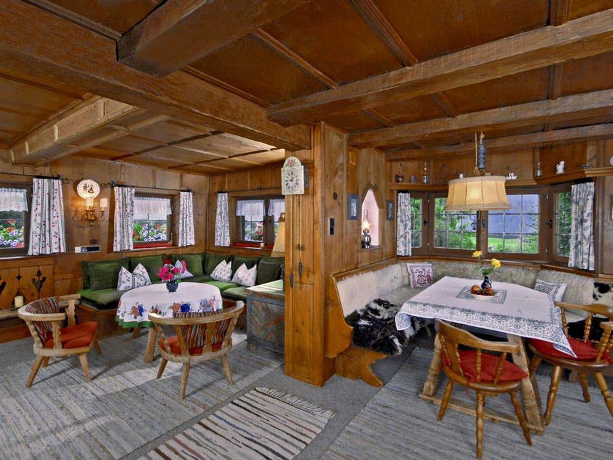 Im Erdgeschoss befindet sich ein Wohnraum mit Essplatz, außerdem eine gemütliche Couchecke mit rundem Tisch und offenem Kamin. Der große Raum ist mit antikem Holz vertäfelt und mit schönen alten Bauernmöbeln eingerichtet. Eigenes WC.