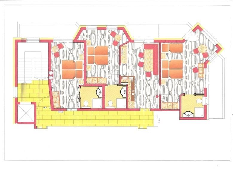 Das Appartement verfügt über 3 getrennte Schlafzimmer mit jeweils eigener Dusche und WC, Haarfön, Schminkspiegel. Die Zimmeraufteilung besteht aus 1 Dreibettzimmer und 2 Doppelzimmer, einer separaten Küche ausgestattet mit Mikrowelle, Backofen mit 4 Herdplatten, Kühlschrank mit Gefrierfach, Spülmaschine, Geschirr, Pfannen usw.
