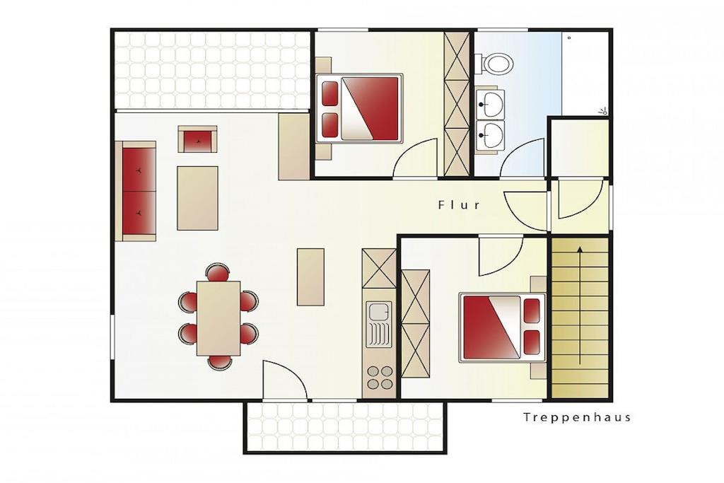 Das mit viel Liebe neu erbaute Luxuschalet bietet vier Personen auf ca. 80 m² einen großzügigen Raum für Urlaub und Erholung. Die gesamte Etage steht Ihnen alleine zur Verfügung! Auf 40 m² erstreckt sich der Mittelpunkt der Wohnung – der gemütliche Wohn-Essbereich mit offener Küche und einem großen Flachbild-TV. Genießen Sie die Sonne auf unserer zusätzlich ca. 10 m²großen Dachterrasse. Die 2 Schlafzimmer (180 cm Doppelbetten mit Komfortmatratzen) sind rustikal eingerichtet und verfügen jeweils über einen Flachbild-TV. Das großzügige Badezimmer besteht aus Sportdusche (Rainedance) Doppelwaschbecken, Kosmetikspiegel, Föhn und natürlich einer Fußbodenheizung.