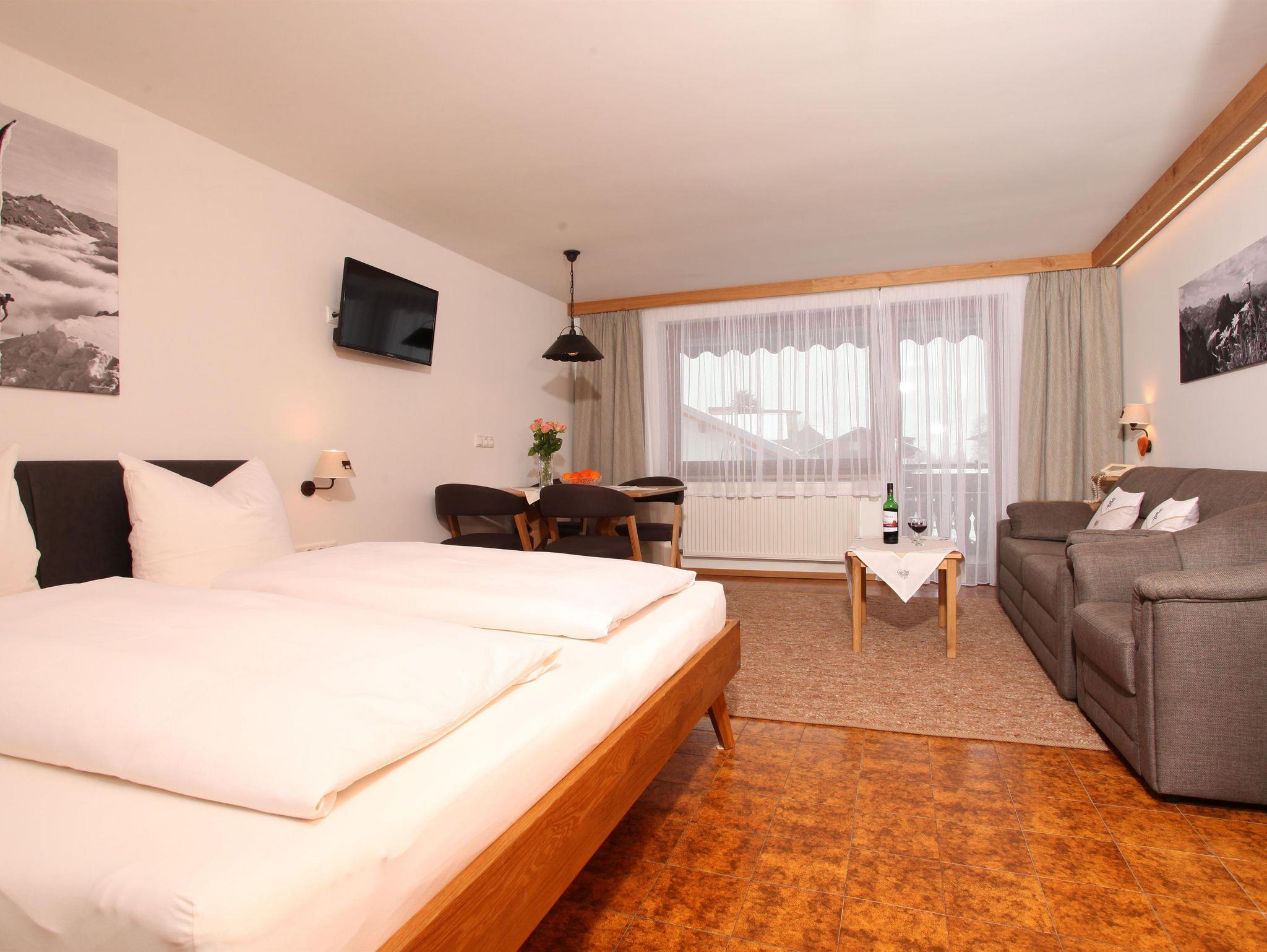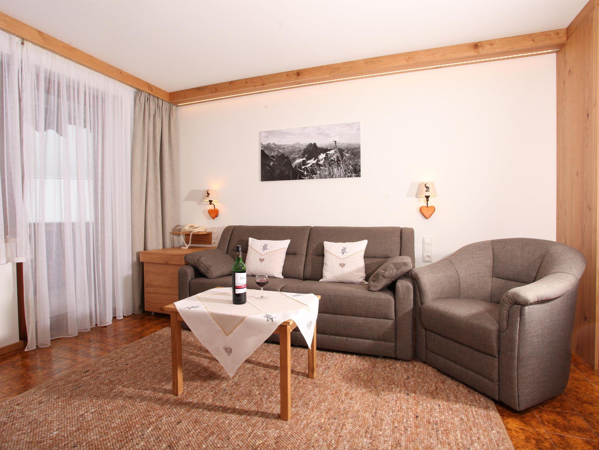 Komfortables Apartment mit 41qm mit großem Wohn- und Schlafbereich. Doppelbett, Ausziehcouch mit Sessel, komfortable Essecke, sep.Küche, sep.Dusche, sep. WC. Standard sind Fliesenboden mit Fußbodenheizung, sowie Radiatoren, Telefon, Sat-TV und Safe, W-Lan. Südbalkon mit Markise oder Südterrasse mit Liegewiese sowie Komfortliegestühlen und Bergblick. Brötchenservice oder auf Wunsch Frühstücksservice.