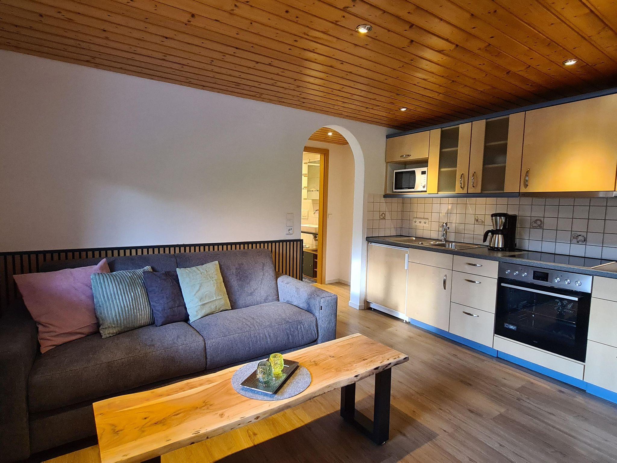 Unser Appartement hat einen separaten Eingang mit Garderobe, separates Schlafzimmer, Badezimmer mit Dusche, Küche mit Backofen und Mikrowelle, gemütliches Wohnzimmer mit Schlafcouch und Essecke, Terasse mit Blick in die Walser Berge