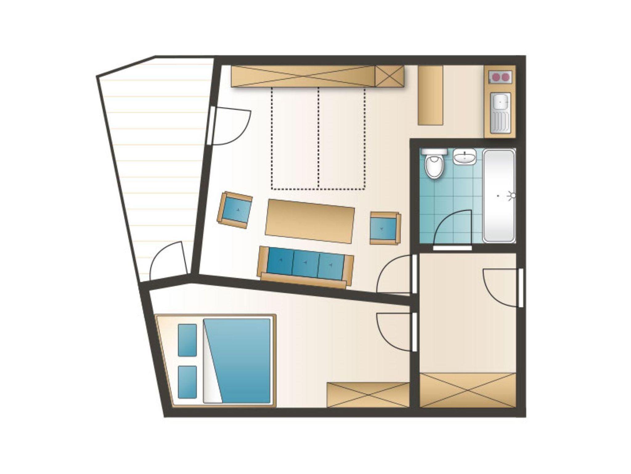 Komfortables 2-Raum Appartement für 2-4 Personen mit Queensize-Bett im Schlafzimmer und einer weiteren Schlafmöglichkeit für 2 Personen im Wohnbereich in Form von Schrankbett oder Schlafsofa. Das Appartement verfügt über eine Kochnische, einen privaten Balkon, ein Bad mit Dusche oder Wanne und Flatscreen-TV. Von Mai bis November ist das Bergbahnticket inklusive.
