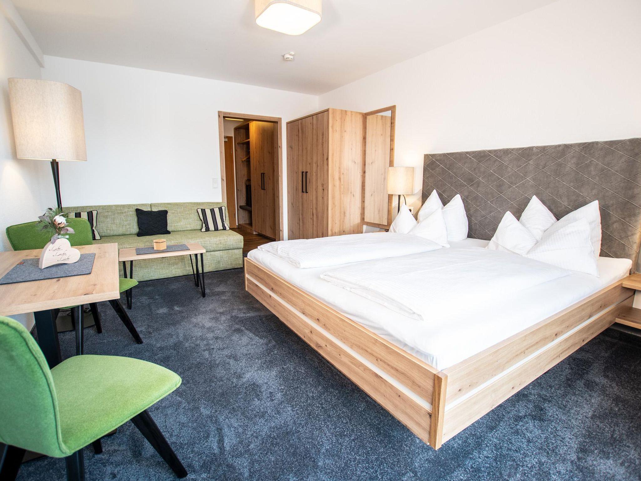 Doppelzimmer mit Balkon und Blick auf das Fellhorn. Ausgestattet mit modernen Möbeln im Eichenholzstil, einem Esstisch mit Stühlen sowie einer Küchenzeile und einer ausziehbaren Couch. Bad mit Dusche, WC und Föhn.