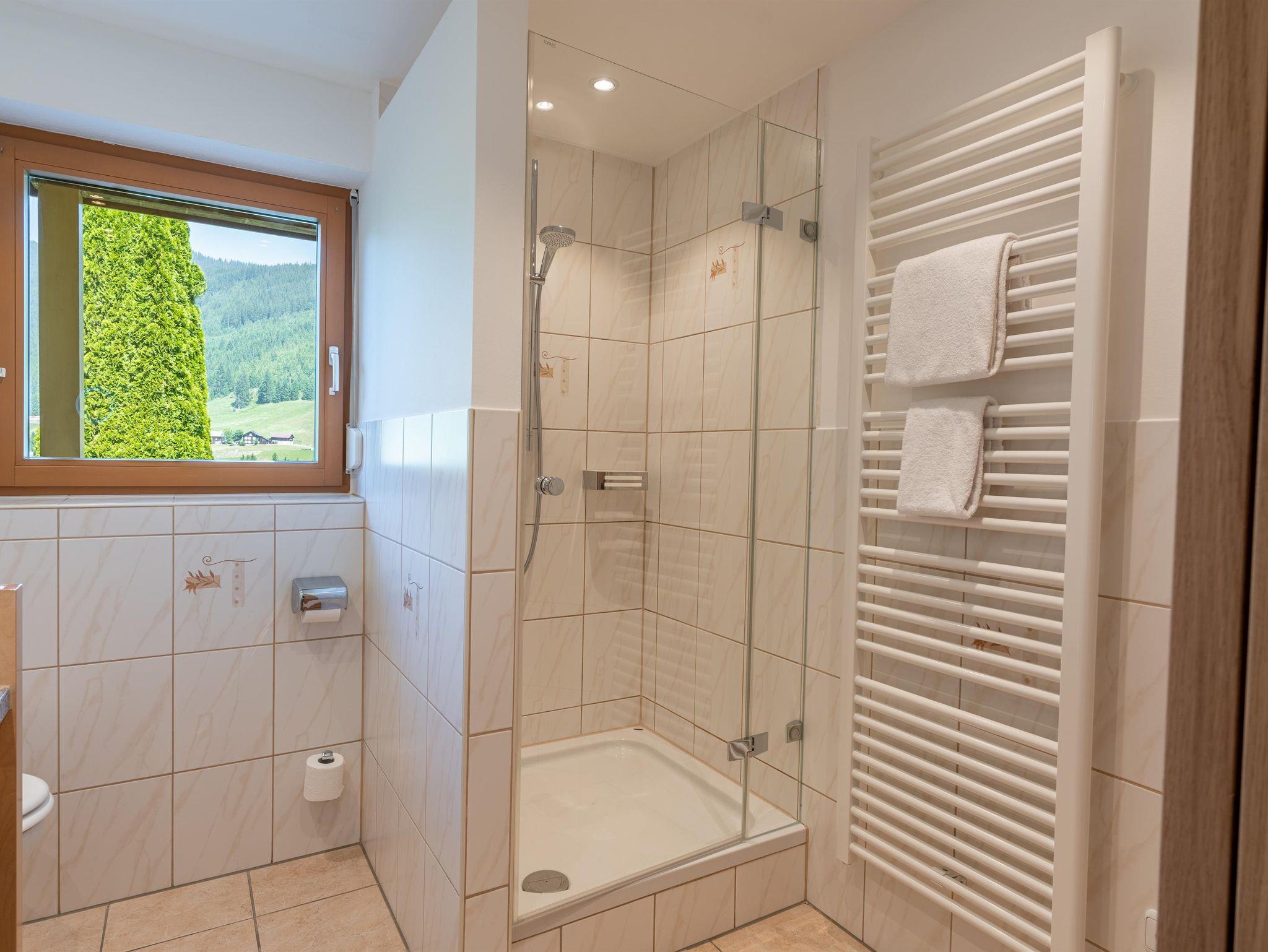 • großes Badezimmer mit Fenster, Dusche, WC, Föhn und Handtuchwärmer