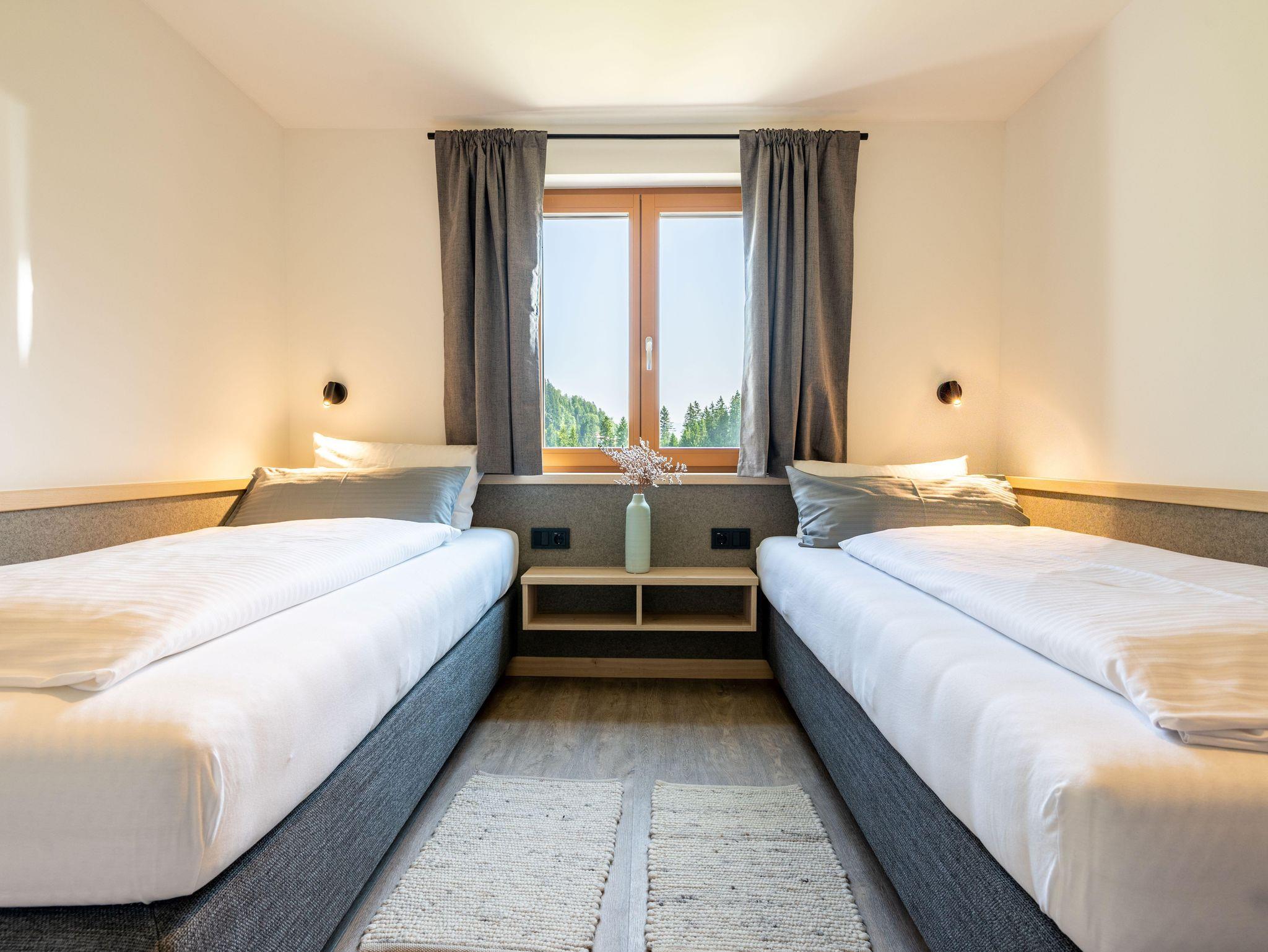 • ein Schlafzimmer mit Doppelbett sowie ein Schlafzimmer mit zwei Einzelbetten