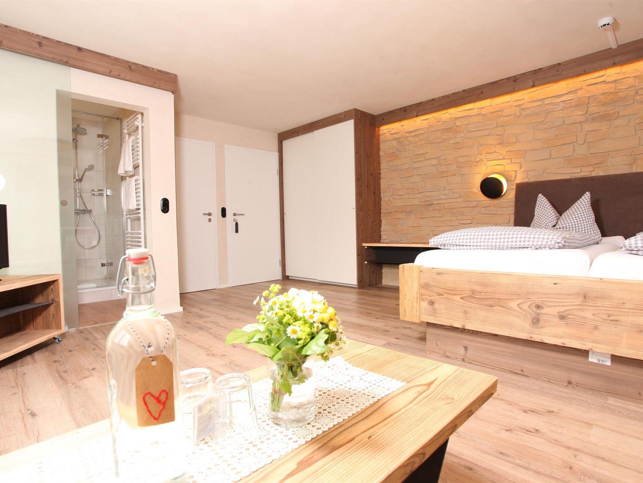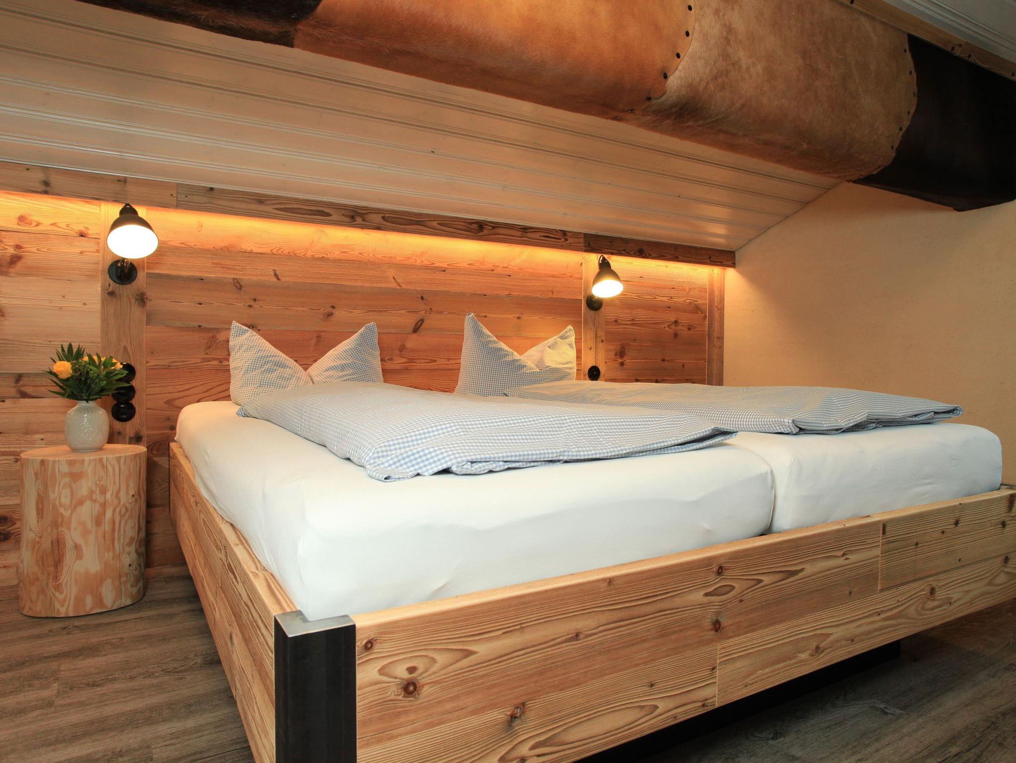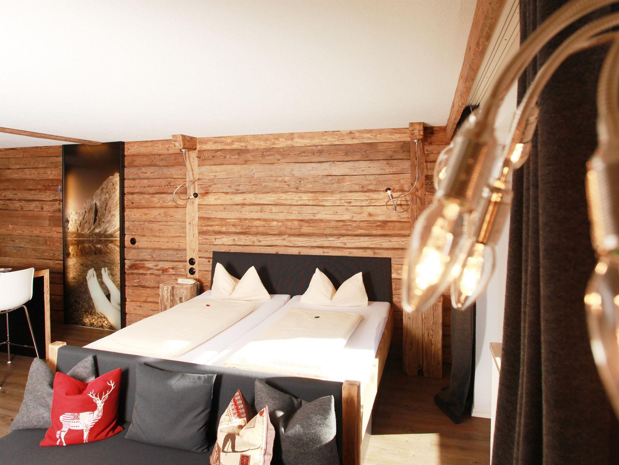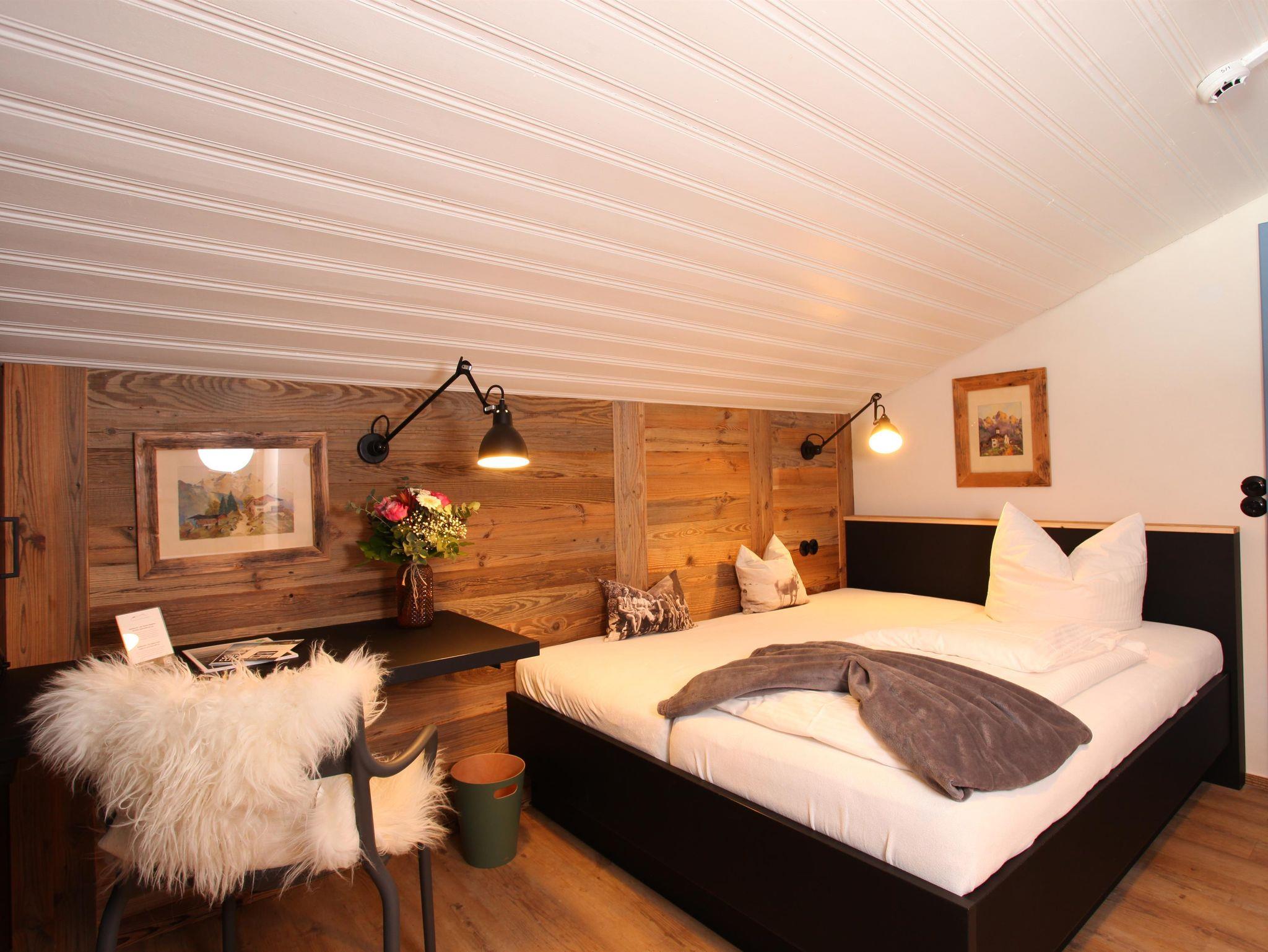 Doppelzimmer Alpenliebe verbindet die Tradition der Alpen mit modernen Design. Das DZ Alpenliebe überzeugt mit handgefertigten Möbeln vom heimischen Schreiner, Queensize Bett 160x200, großem Bad mit DU/WC und Hotelfön, Flatscreen SAT-TV, W-LAN, Safe, Designerlampen, Designvinylboden, Schreibtisch, Radiowecker, Wasserkocher mit Kaffee- und Teeauswahl, Kühlschrank, ohne Balkon, 2.OG, Größe ca. 18 qm.