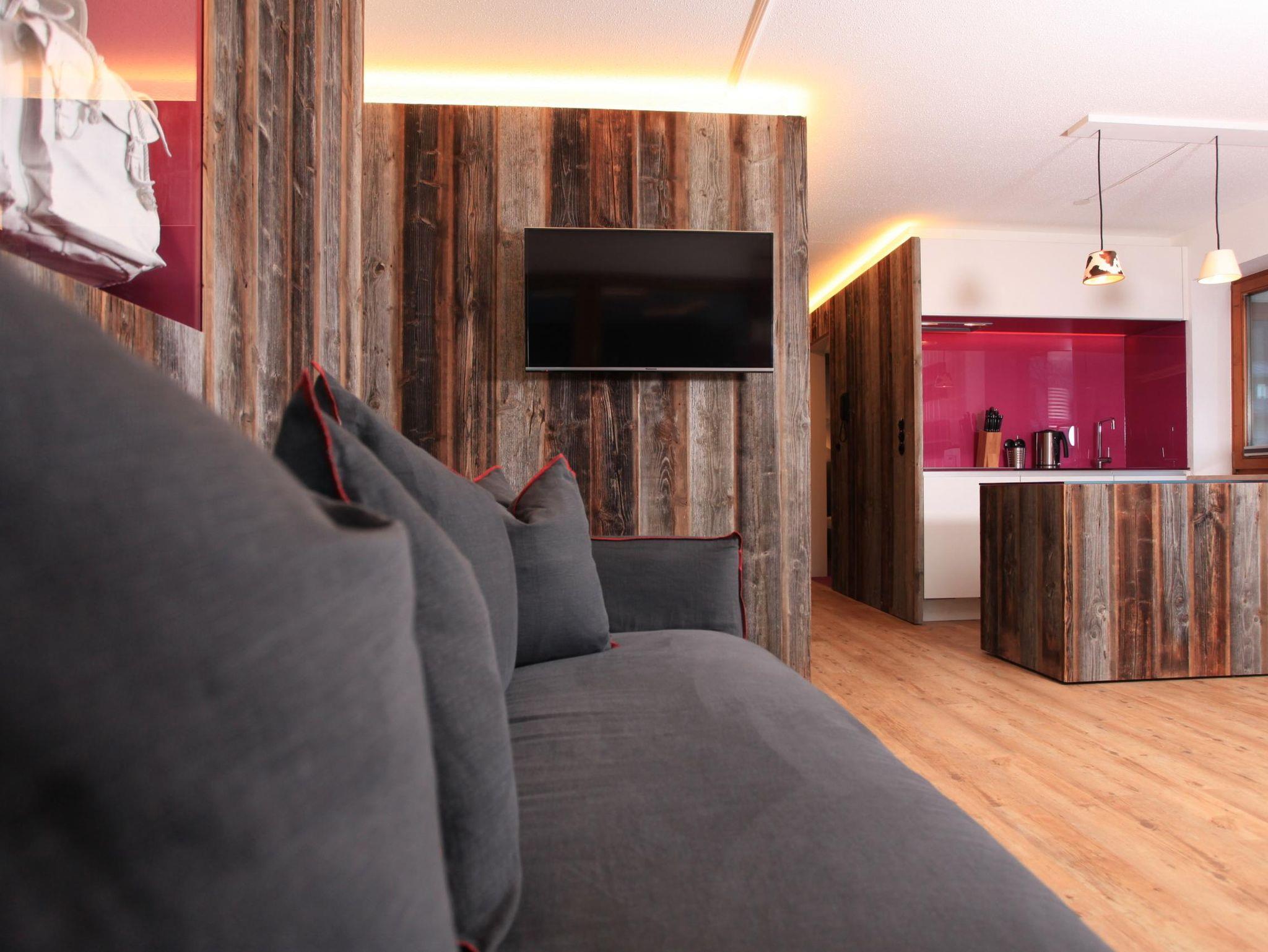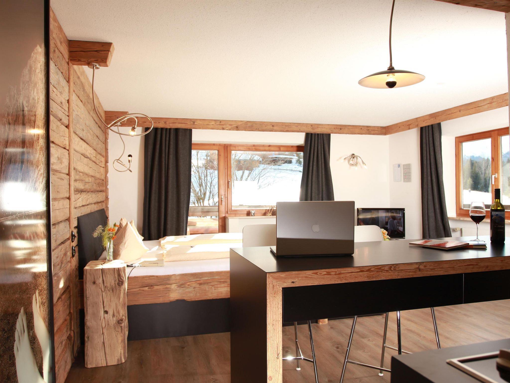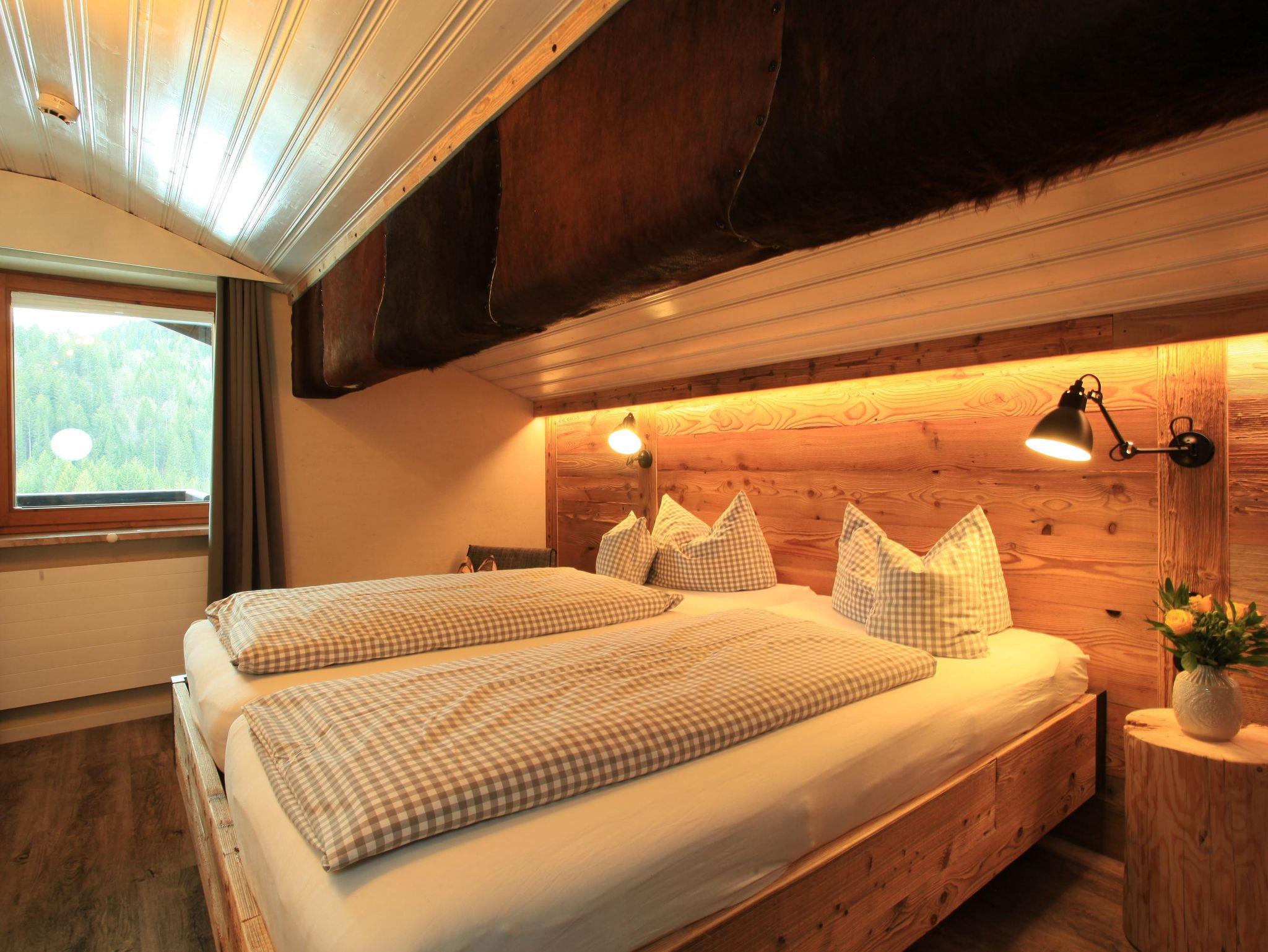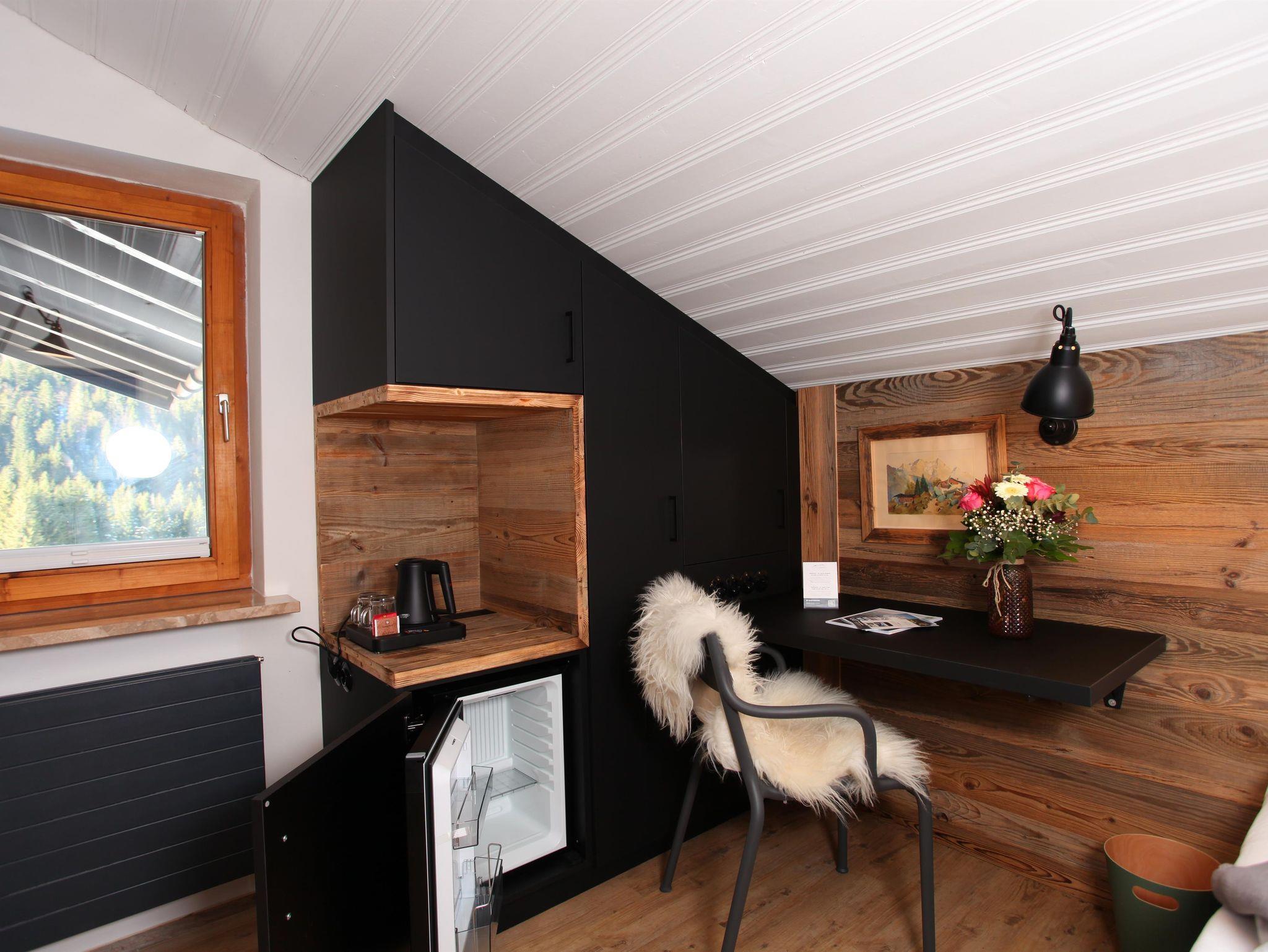Doppelzimmer Alpenliebe verbindet die Tradition der Alpen mit modernen Design. Das DZ Alpenliebe überzeugt mit handgefertigten Möbeln vom heimischen Schreiner, Queensize Bett 160x200, großem Bad mit DU/WC und Hotelfön, Flatscreen SAT-TV, W-LAN, Safe, Designerlampen, Designvinylboden, Schreibtisch, Radiowecker, Wasserkocher mit Kaffee- und Teeauswahl, Kühlschrank, ohne Balkon, 2.OG, Größe ca. 18 qm.