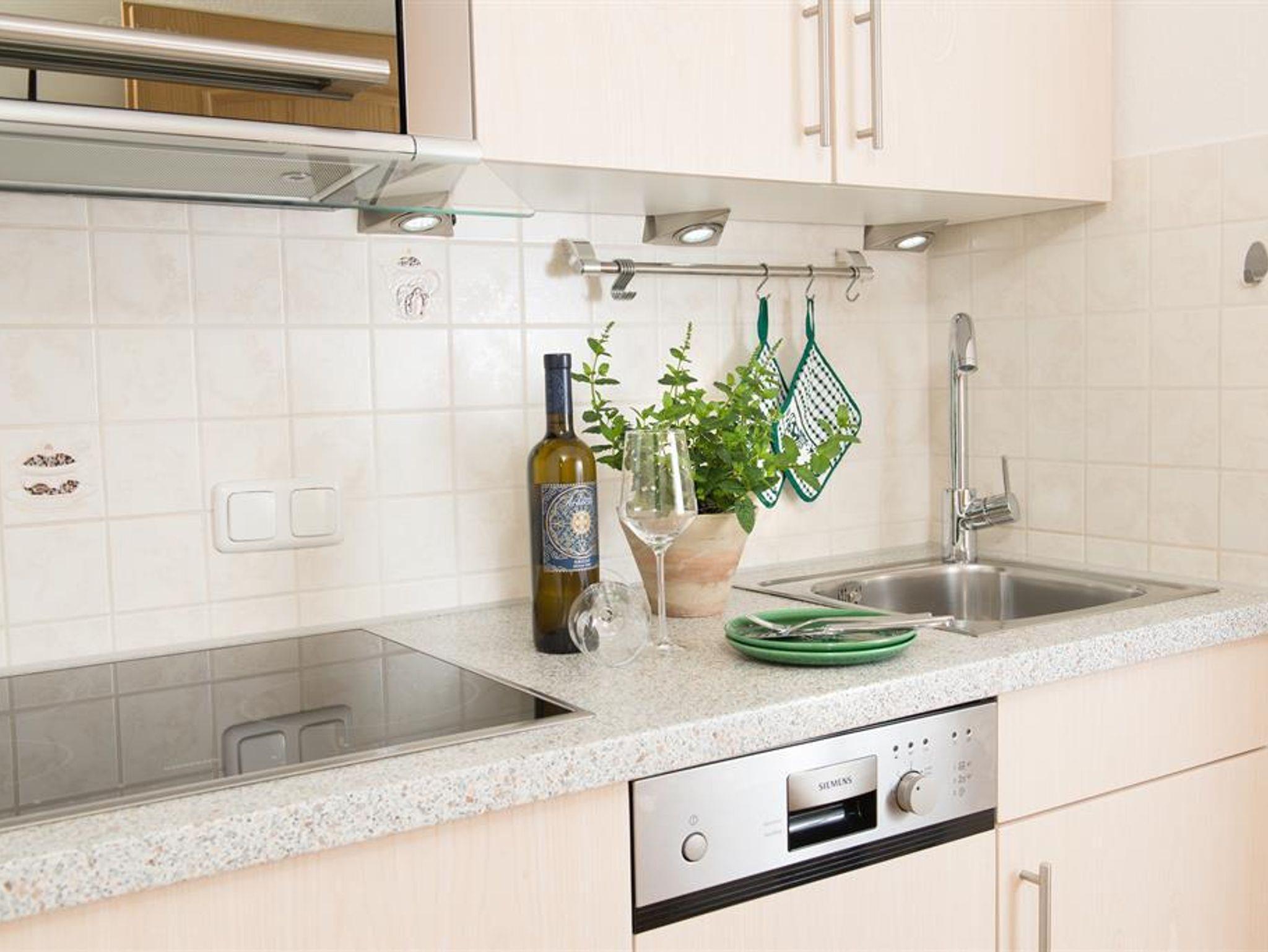 Voll ausgestattete kleine Küchenzeile mit Spülmaschine und Microwelle.