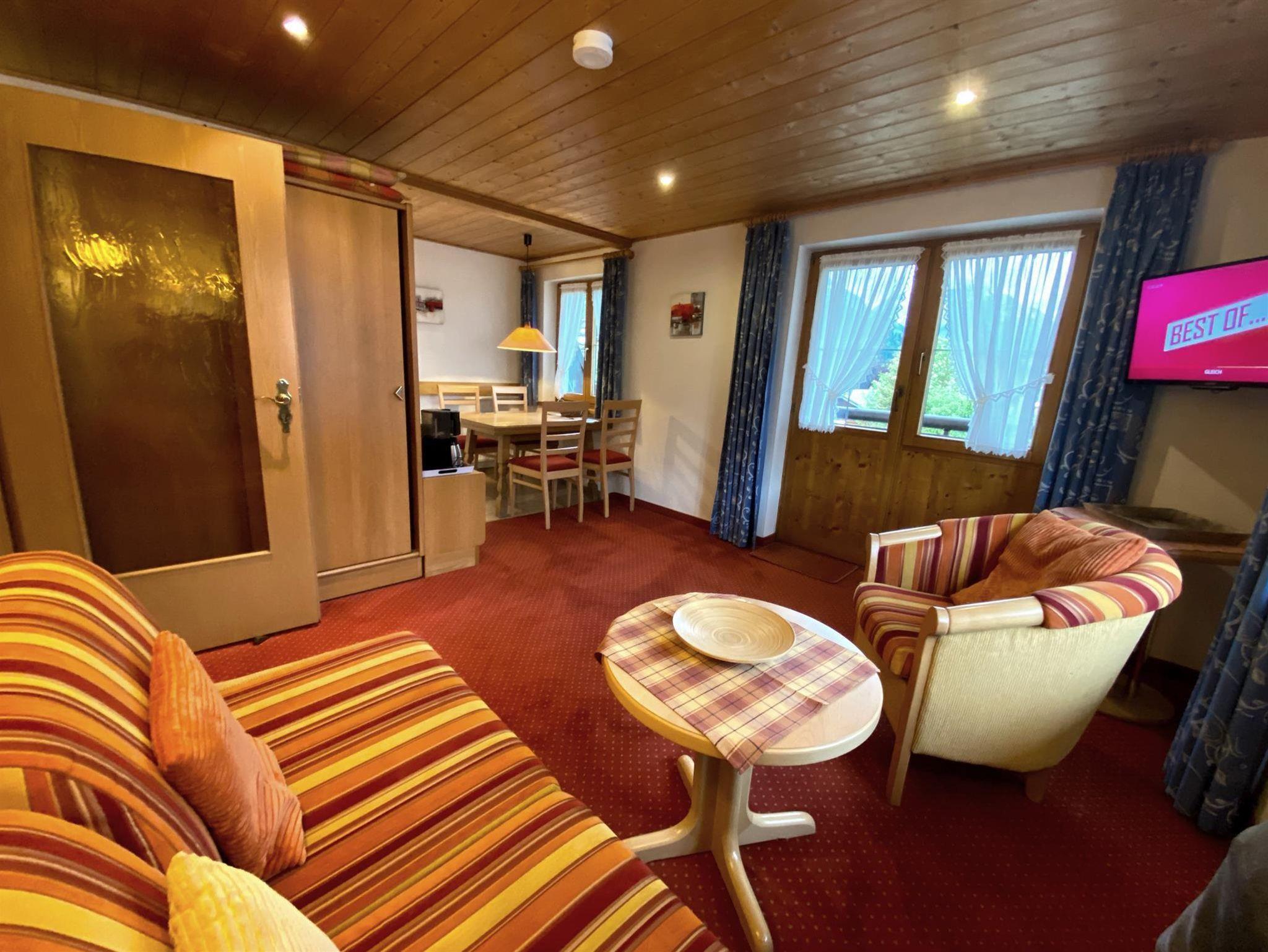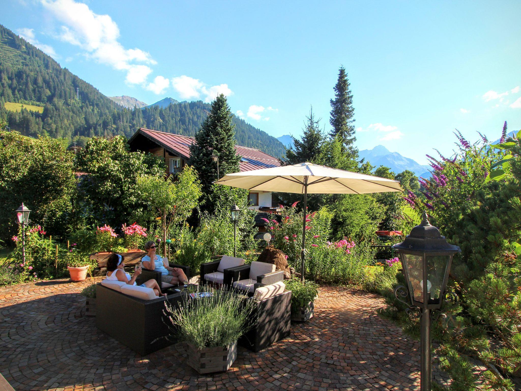 Großer Garten mit Liegewiesen. Bus, Bergbahn, Restaurants fünf Gehminuten. Im Sommer Bergbahntickets inklusive.