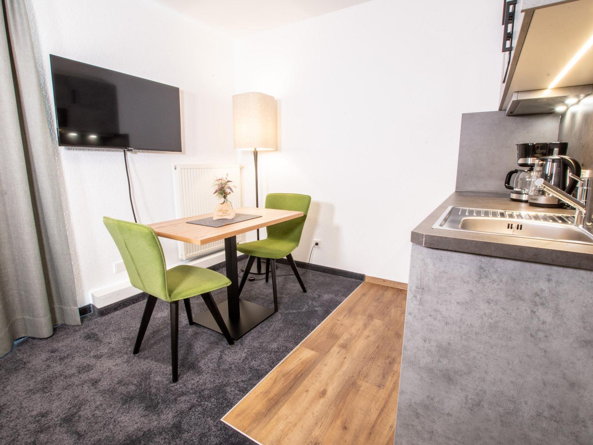 Doppelzimmer mit Balkon und Blick auf die Gehrenspitze. Ausgestattet mit modernen Möbeln im Eichenholzstil, einem Esstisch mit Stühle sowie einer Küchenzeile eignet sich das Zimmer für 2 Personen.
