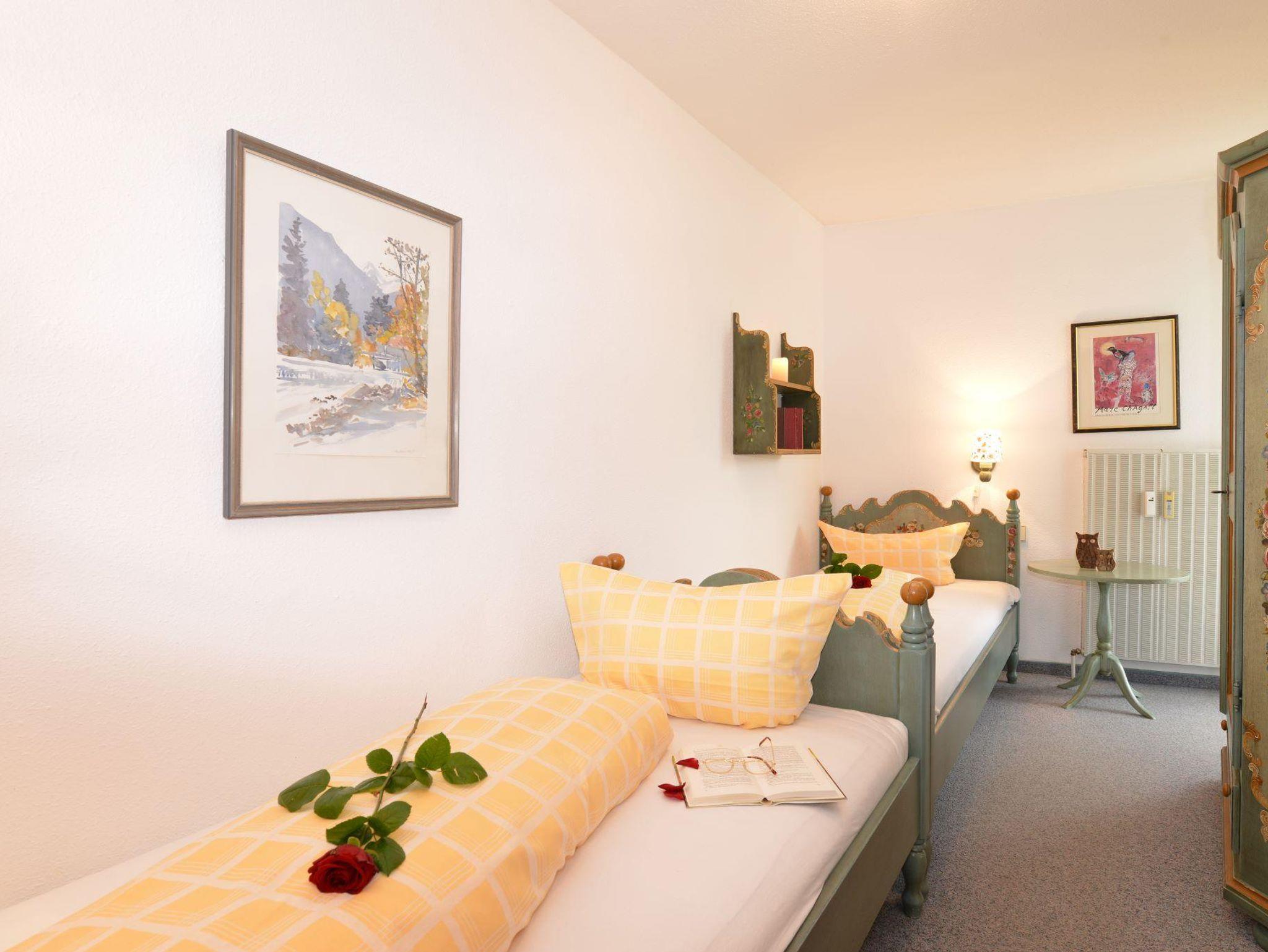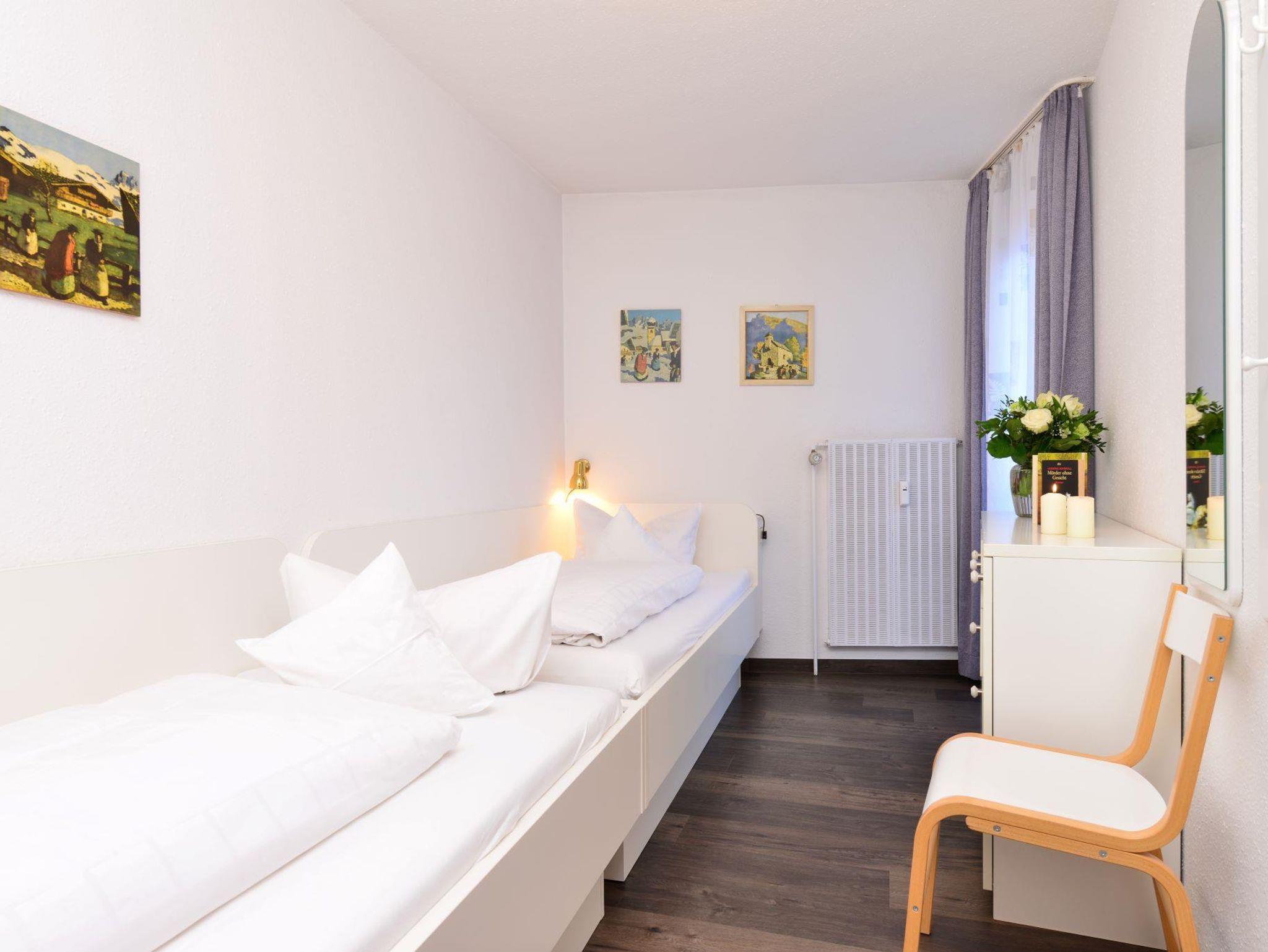 Komfortables 2-Raum Appartement für 2-4 Personen mit Einzelbetten im Schlafzimmer und einer weiteren Schlafmöglichkeit für 2 Personen im Wohnbereich in Form von Schrankbett oder Schlafsofa. Das Appartement verfügt über eine Kochnische, einen privaten Balkon, ein Bad mit Dusche oder Wanne und Flatscreen-TV. Von Mai bis November ist das Bergbahnticket inklusive.