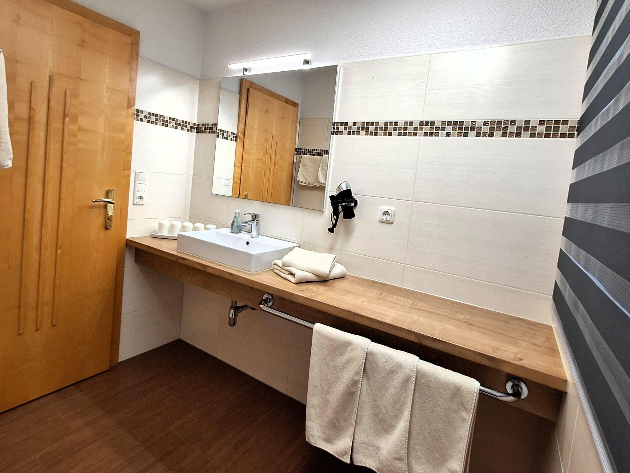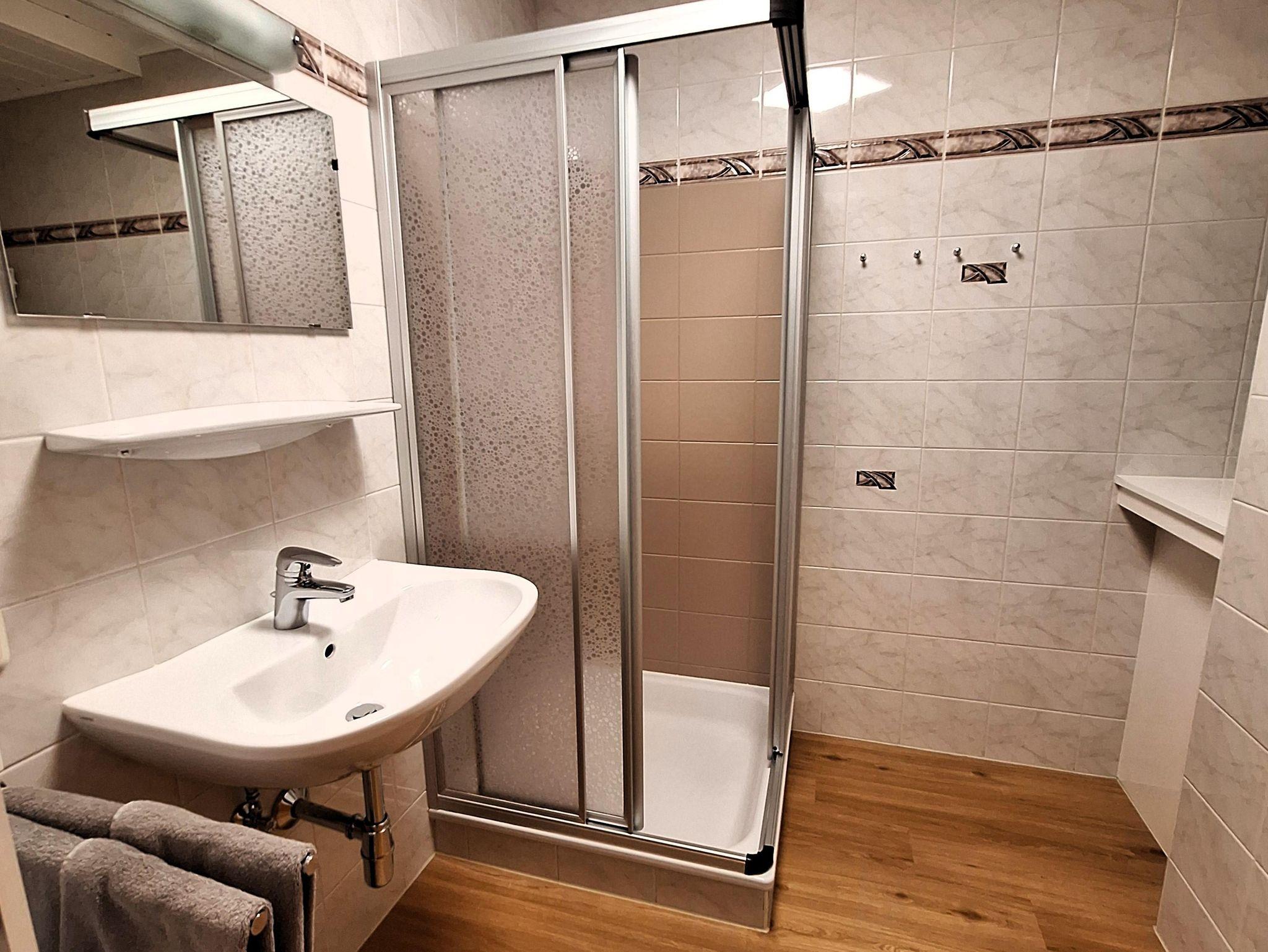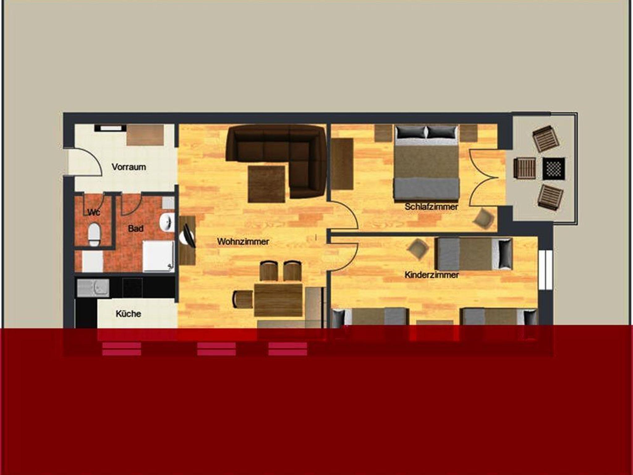 Sehr geräumige Ferienwohnung mit 70m² für 1-7 Personen. Die Wohnung hat einen Vorraum, Dusche, WC getrennt, ein Kinderzimmer mit 3 Einzelbetten, ein Doppelbettzimmer mit Balkon, eine Küche mit Geschirrspüler und Mikrowelle. Wohnraum mit Essecke und einer ausziehbaren Couch. Diese Wohnung befindet sich im 1. Stock.