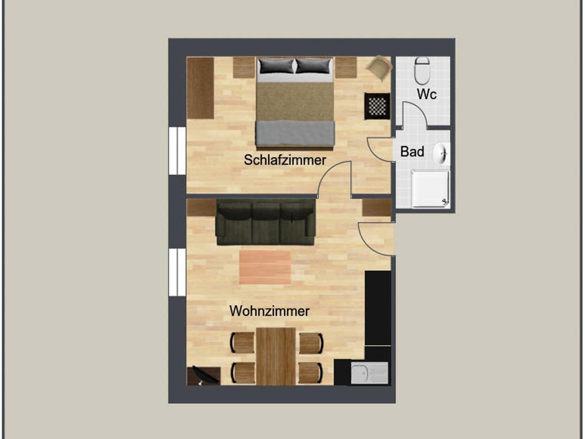 Kleine Zweizimmerwohnung mit 38m² für 2-4 Personen, ein Schlafzimmer mit einem Doppelbett, Dusche, WC. Ein Wohnraum mit ausziehbarer Couch für 2 Personen, mit Sat-TV, Küche und Essecke. Die Wohnung ist im 2. Stock.