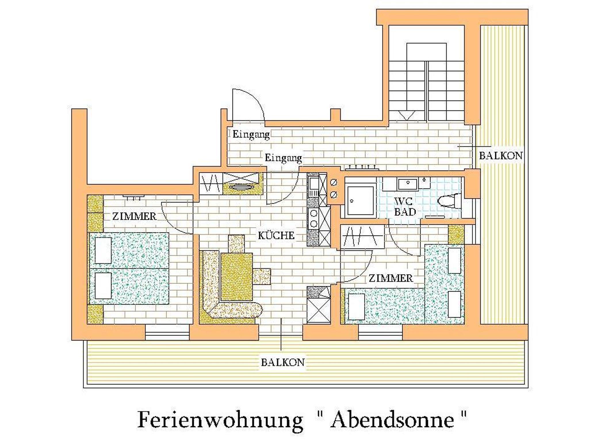 Unsere Ferienwohnung ABENDSONNE ist eine gemütliche und neu möblierte Wohnung mit 48m². Die moderne Wohnküche ist komplett eingerichtet mit einer gemütlicher Sitzmöglichkeit und Satelliten TV. Für den Schlaf gibt es in der Ferienwohnung ein Doppelbettzimmer und kleines Zweibettzimmer mit Durchgang zum neusanierten Badezimmer mit Dusche und WC.