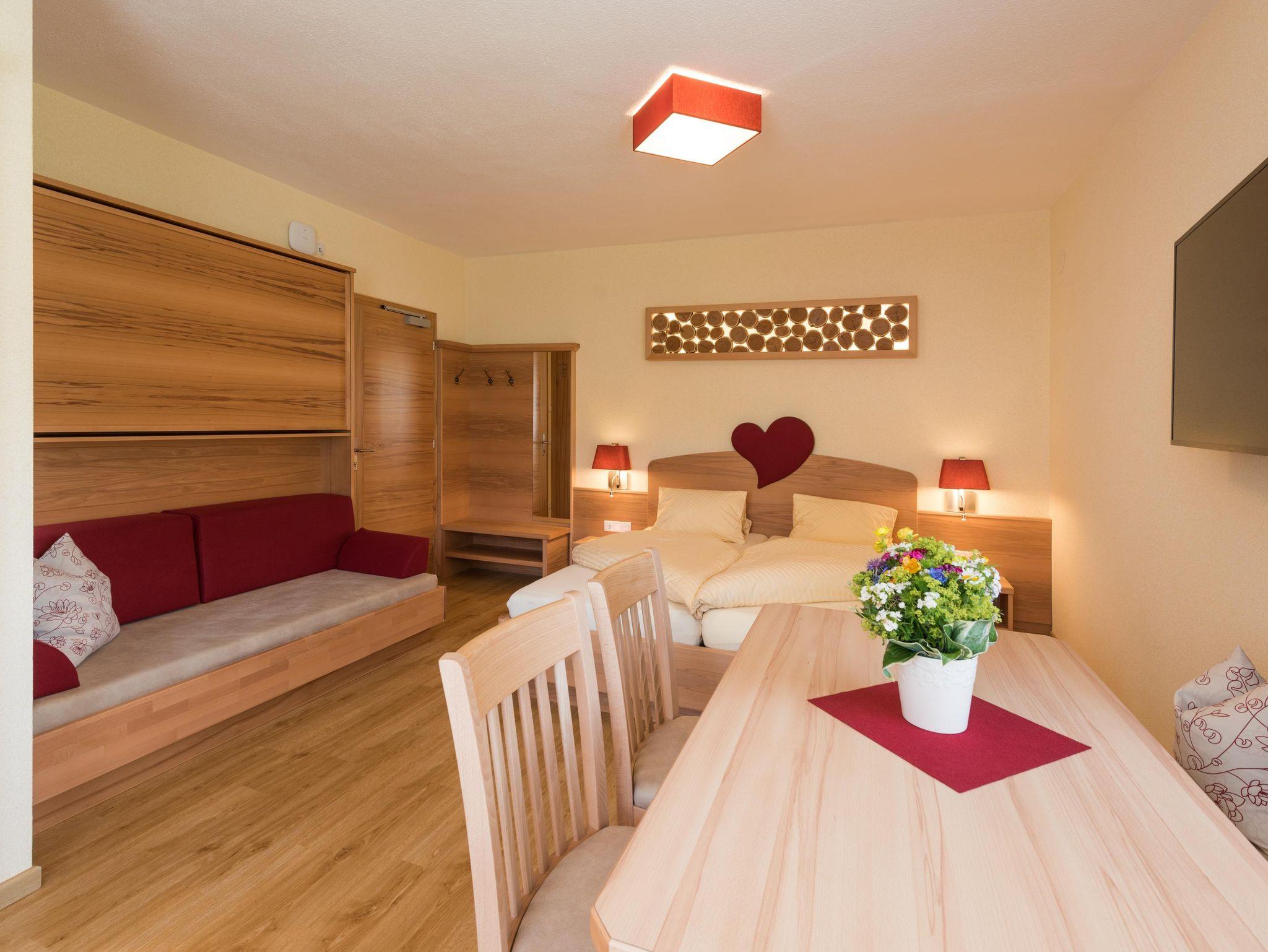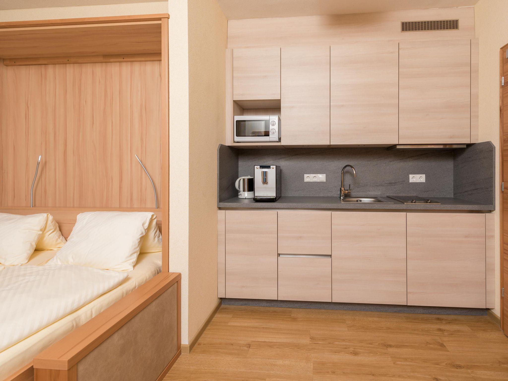 Im Frühjahr 2016 komplett saniert!!! Schlafzimmer: * Handgefertigte Zirbenholzmöbeln * Doppelbett mit hochwertigen QUL-zertifizierten Relax-Matratzen * Kabel-TV * Balkon mit Talblick und Morgensonne Badezimmer: * Waschtisch * Dusche * WC * Handtuchtrockner * Leistungsstarker Fön Wohnraum: * Gemütliche Sitzecke mit Tisch * Kabel-TV * Couch (verschwindet bei Bedarf in der Wand und ein Doppelbett wird hervorgezaubert) * Stockbett (verschwindet in der Wand, wenn es nicht benötigt wird) Küche: * 2 Herdplatten * Mikrowelle * Kühlschrank * Kaffeevollautomat * Geschirrspüler * Wasserkocher * Geschirr und Küchentücher Gesamte Suite: * Fußbodenheizung * gratis WiFi