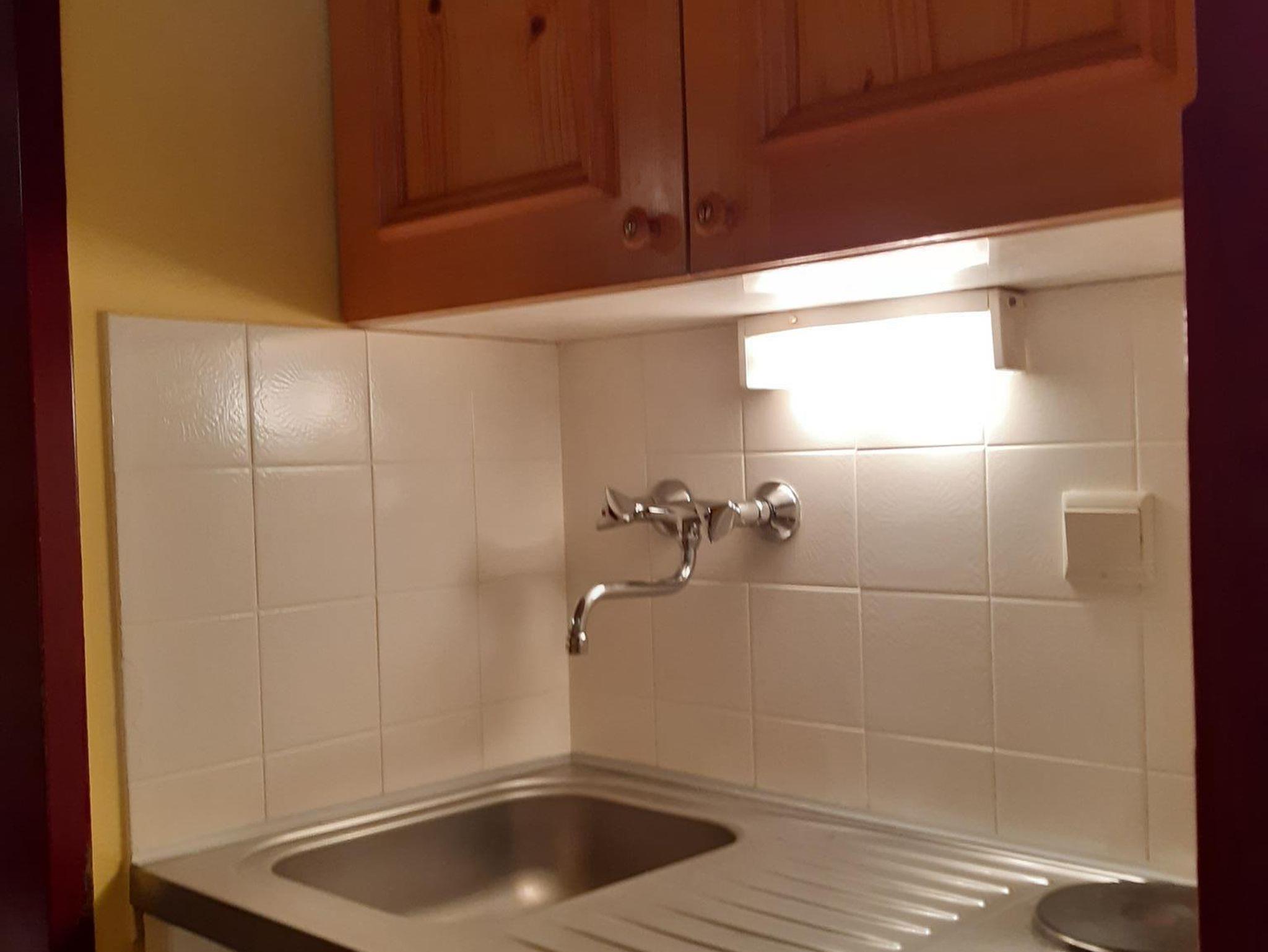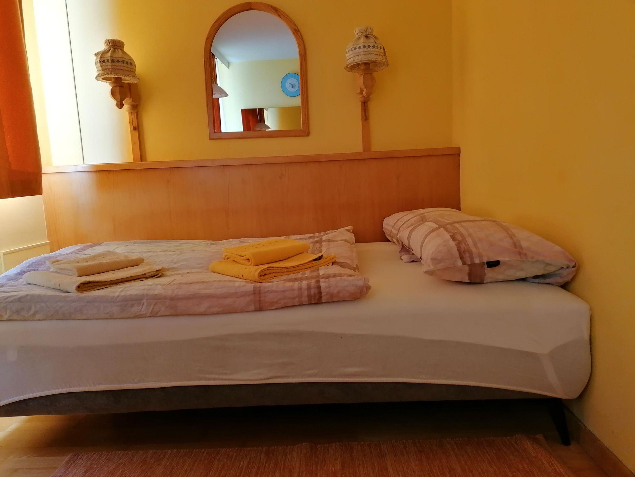 Gemütliches, kleines Studio im Aparthotel Alpine mit Sauna und Fitnessraum. Wohn-Schlafraum mit Doppelbett, Esstisch, Schränke, Kabel-TV, Miniküche mit Spüle, Kühlschrank, Kochplatten, Wasserkocher, Dusche, WC. Bettwäsche, Dusch- und Handtücher im Appartement.